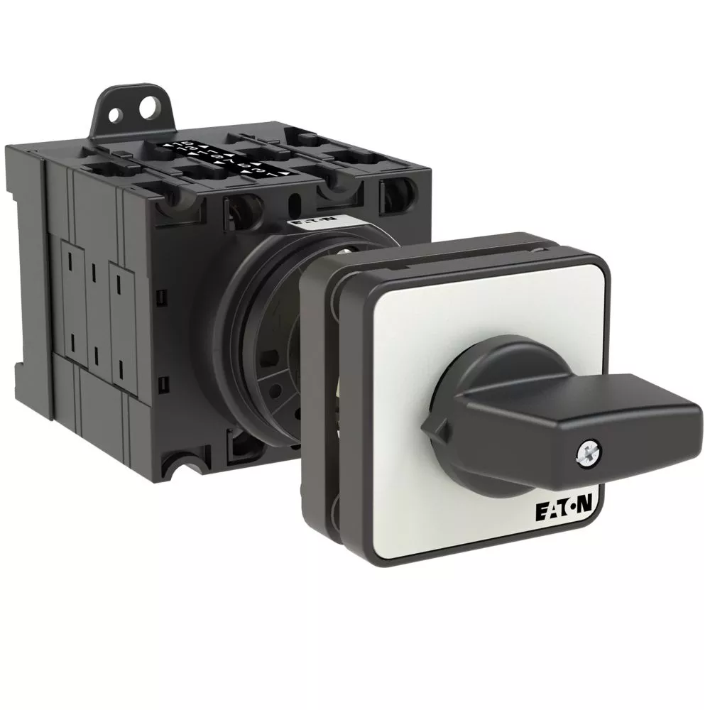 Łącznik krzywkowy wg IEC/EN60947, wielkość konstrukcyjna T3, konstrukcja pośrednia, mocowanie przykręcane zatrzaskowe, napęd sprzęgowy drzwi i pokrywy, tabliczka czołowa 48X48, klasa ochrony na przedzie IP65 z czarnym pokrętłem, pomiarowy prąd stały Iu 32A, znamionowe napięcie pracy Ue 690V, dostępne akcesoria zgodnie z danymi katalogu łączników krzywkowych T