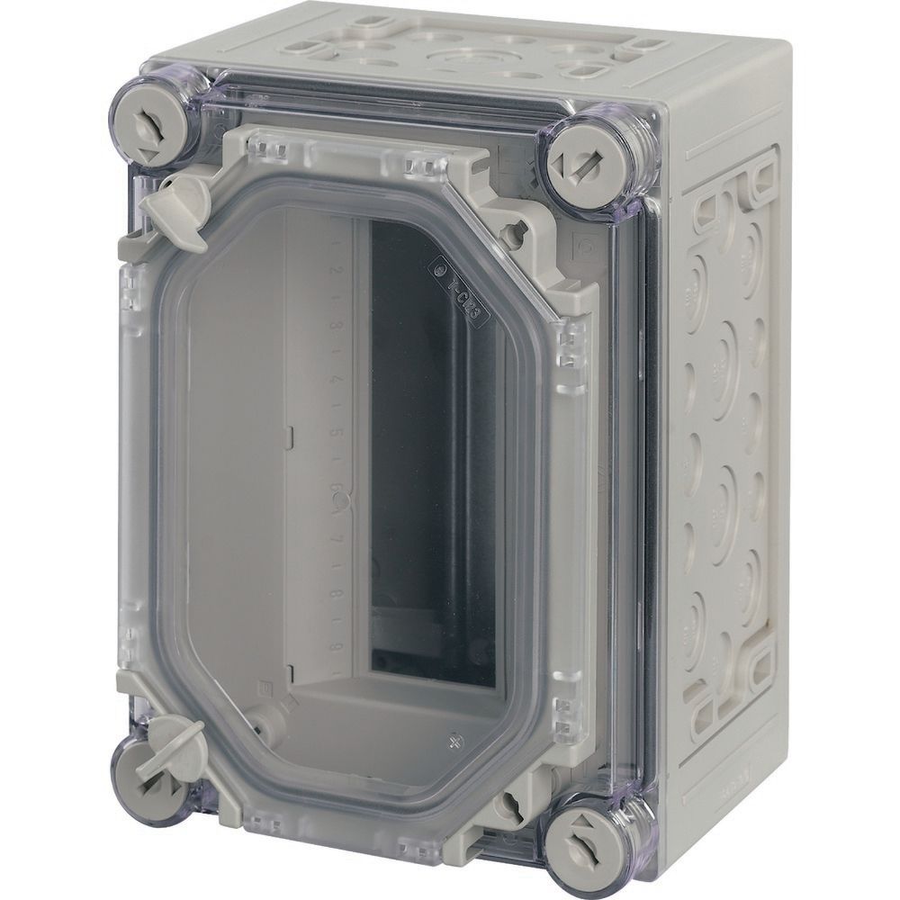 Obudowa dla aparatury modułowej z drzwiami, charakterystyka materiału Poliwęglan (PC), odporność na porażenia, stopień ochrony IP65, metryczne wytłoczenia we wszystkich ścianach bocznych, urządzenia montażowe o rozmiarze 1 zgodnie z DIN 43880, pokrywa przezroczysta z uchwytami do zamykania, drzwi przezroczyste do obsługi wbudowanych urządzeń, szyny nośne do zapinania urządzeń, paski zamykające do nieużywanych miejsc montażowych, pokrywa zabezpieczająca przed dotknięciem z listwami opisowymi, z szynami PE/N, łączniki mocujące do uchwytu ściennego, plombowane zamknięcia pokrywy, ilość JC=9, zaciski PE i N Liczbaxprzekrój 2x(6-16)mm² i 7x(1-4)mm², wersja pokrywy: przezroczysta, wersja drzwi: przezroczysta