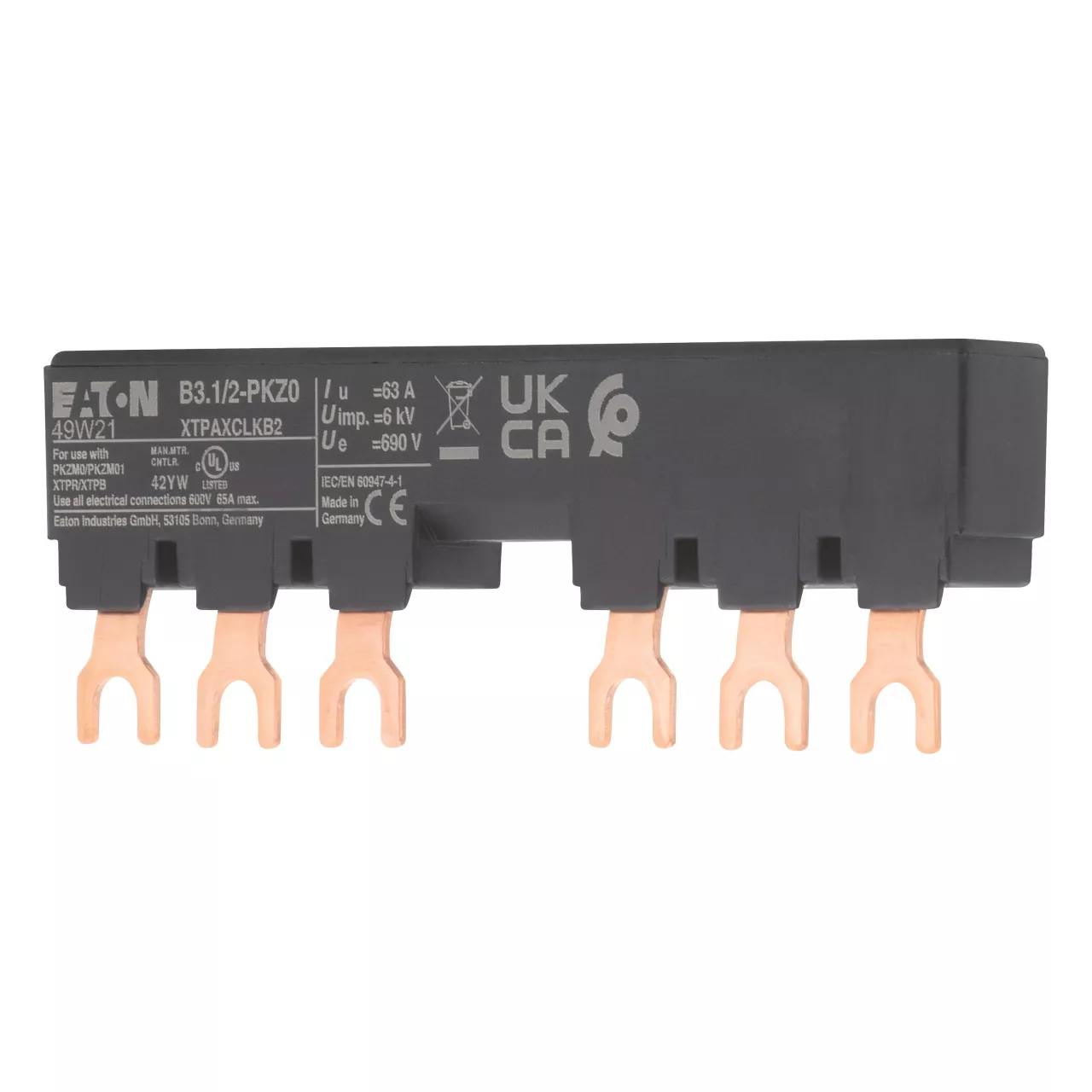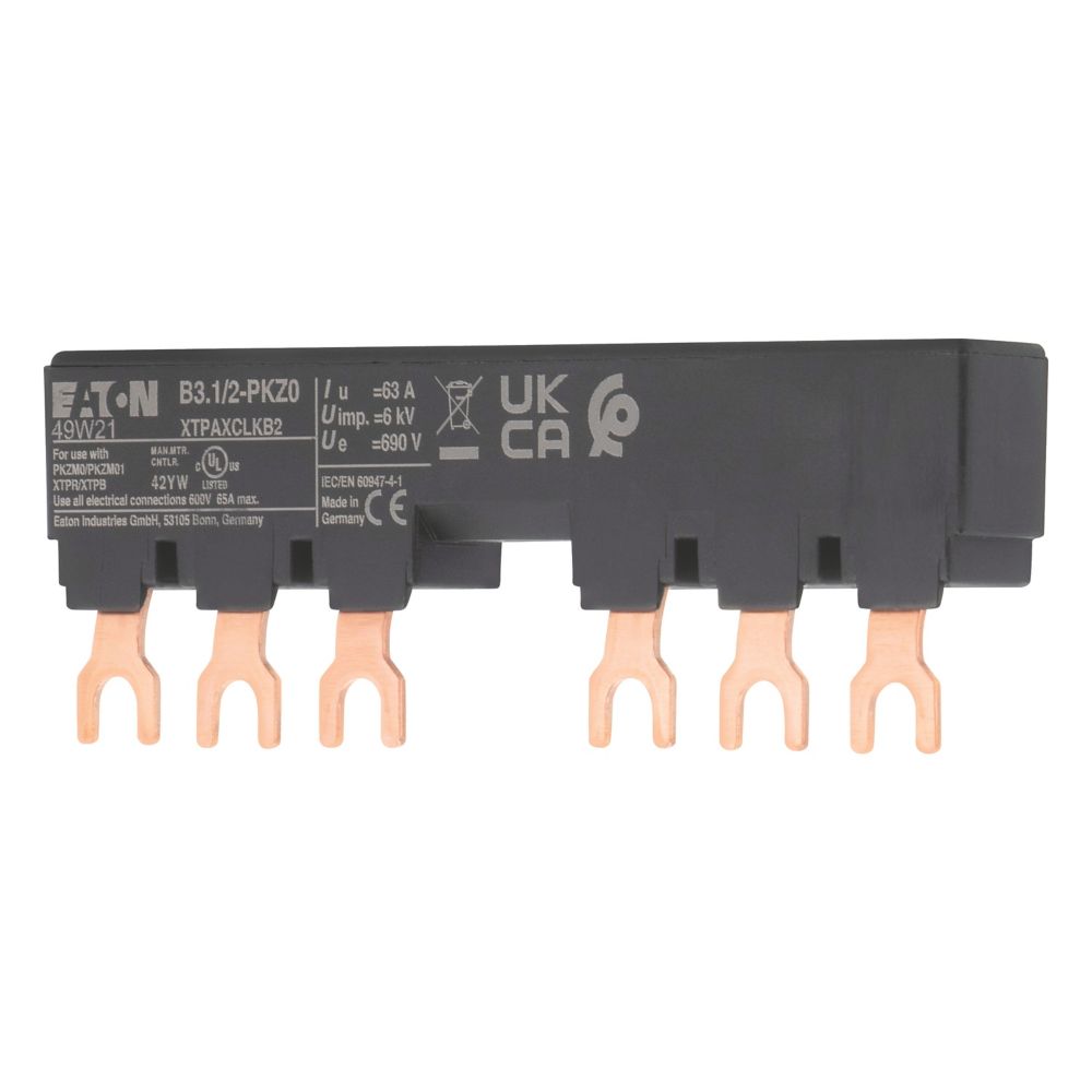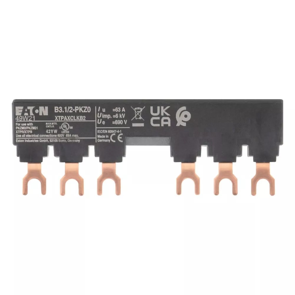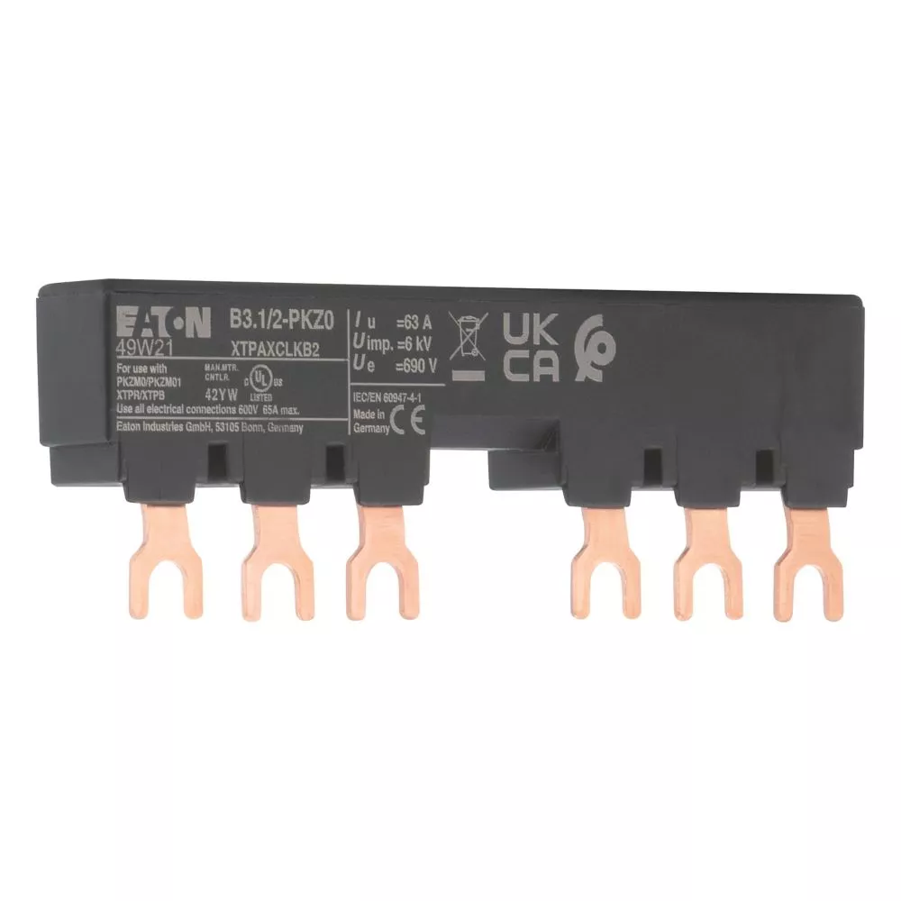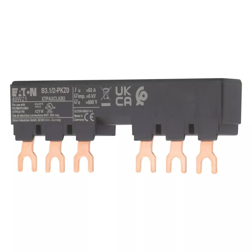 Blok mostków trójfazowych 3 biegunowy do zasilania 2 PKZM0-... z przymocowanymi po prawej stronie łącznikami pomocniczymi lub sygnalizatorami wyzwolenia, długość 99mm, z zabezpieczeniem przed dotykaniem, Ue = 690 V, Iu = 63 A