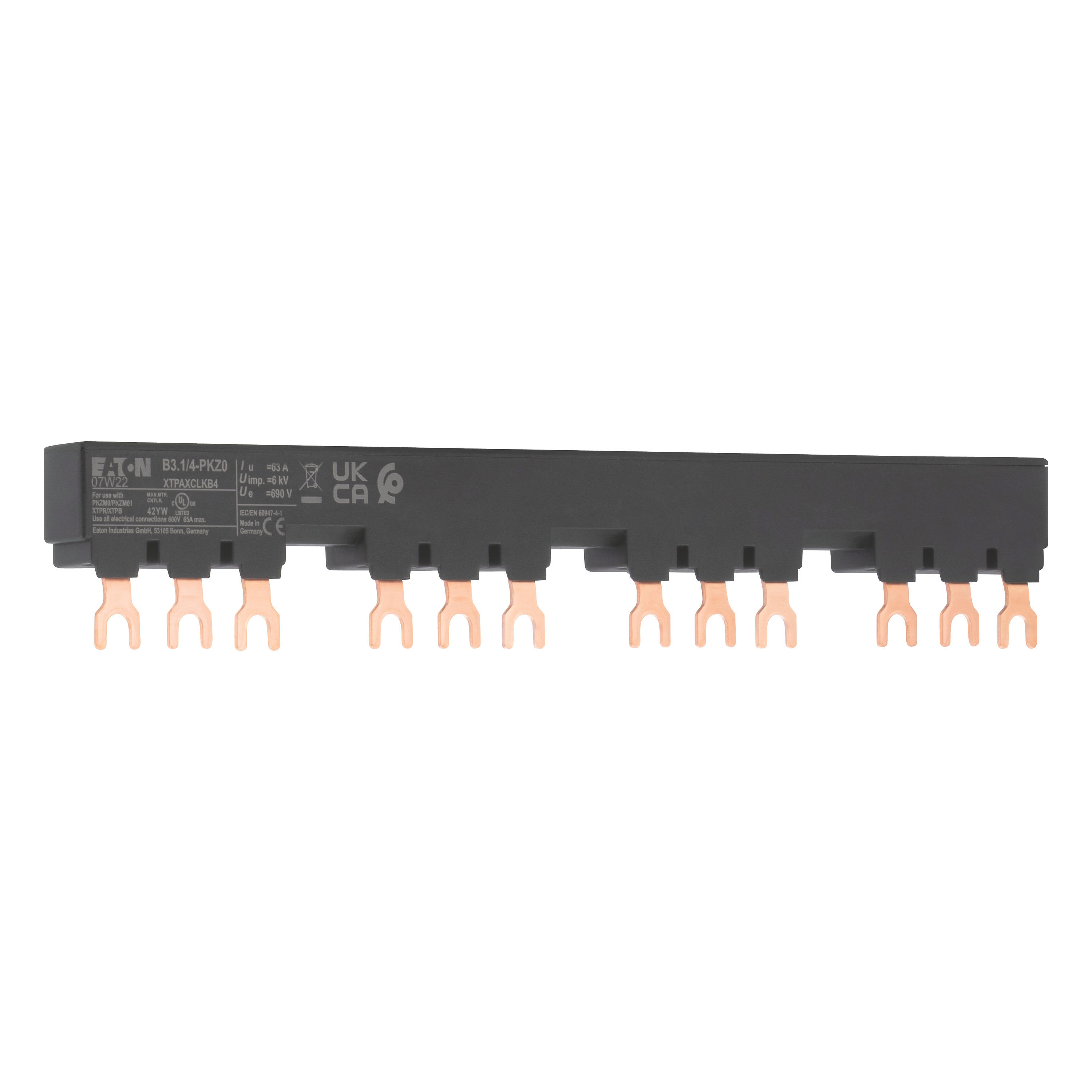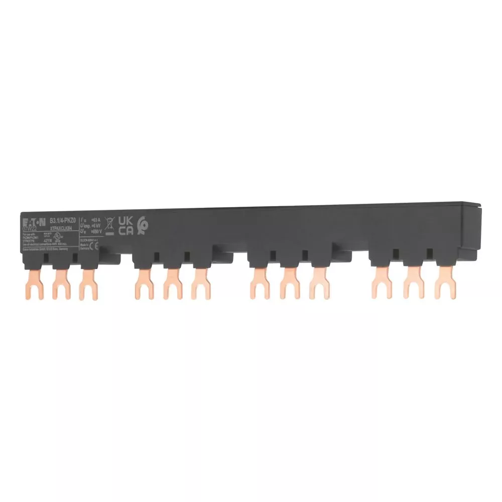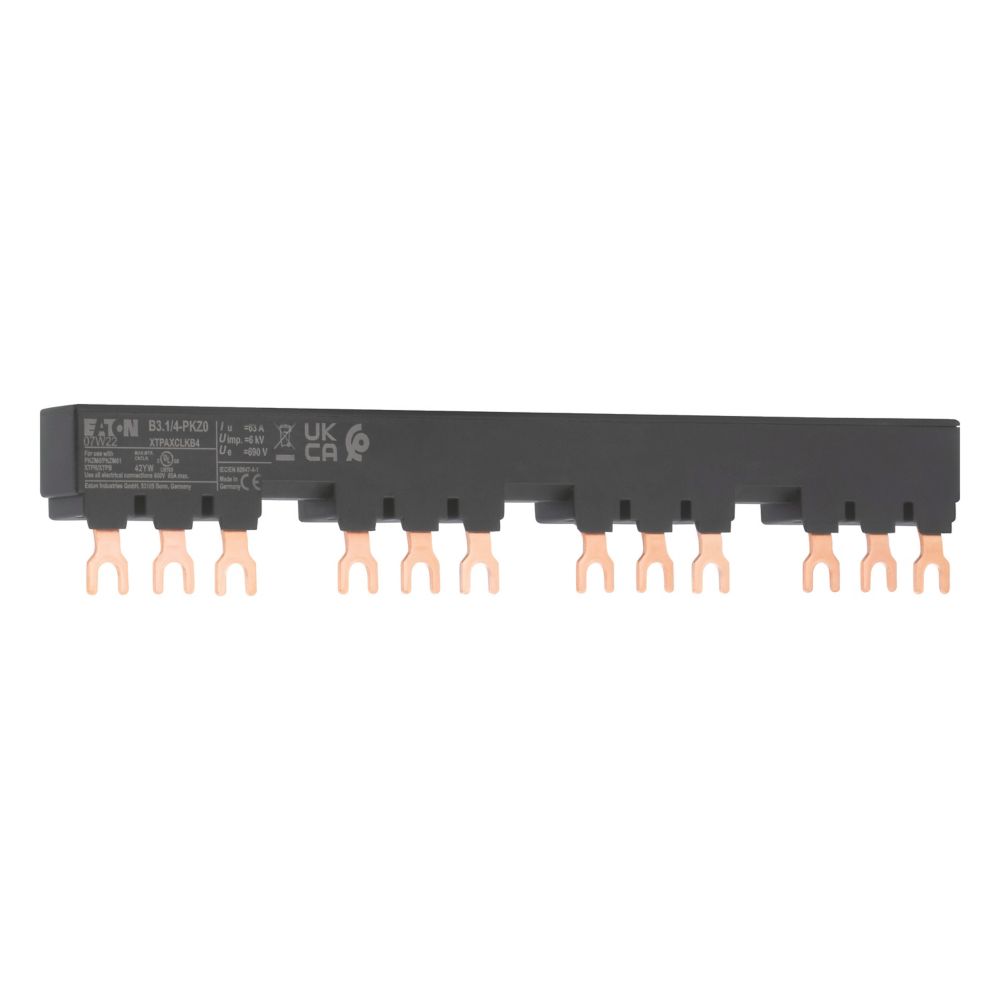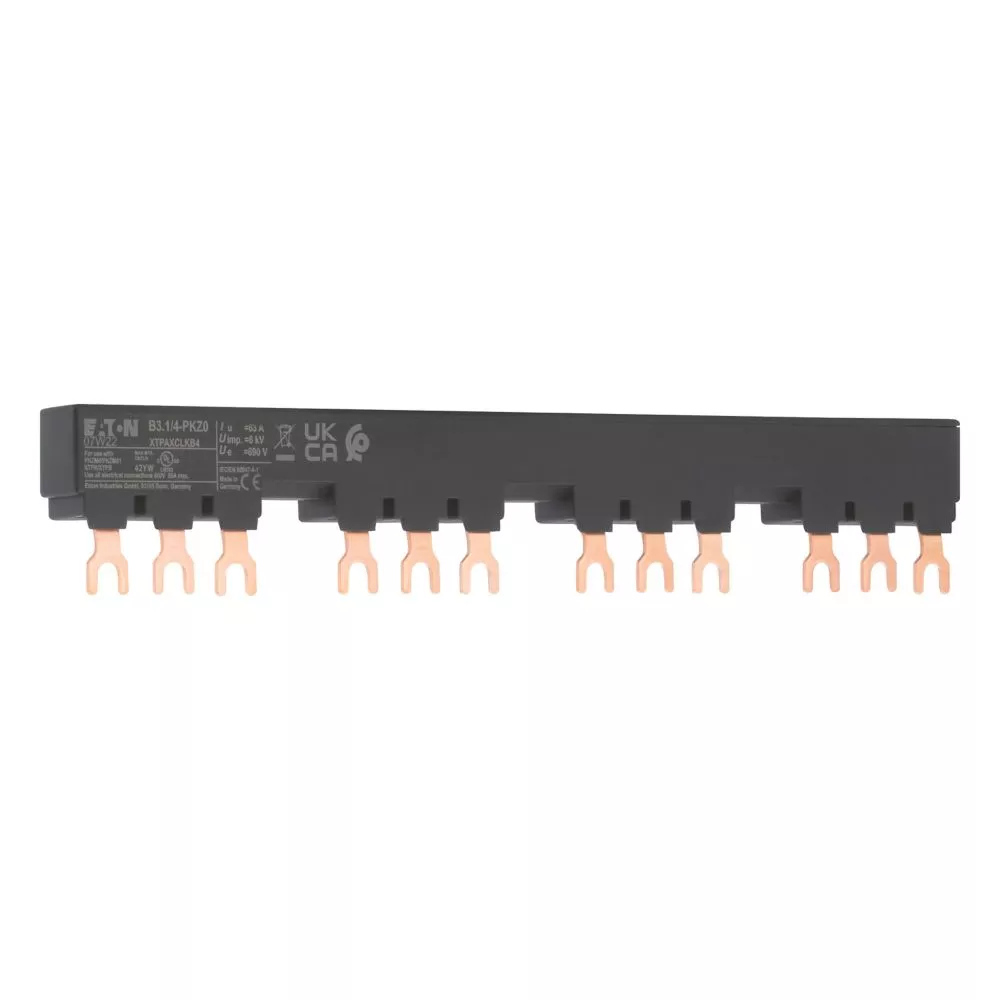 Blok mostków trójfazowych 3 biegunowy do zasilania 4 PKZM0-... z przymocowanymi po prawej stronie łącznikami pomocniczymi lub sygnalizatorami wyzwolenia, długość 207mm, z zabezpieczeniem przed dotykaniem, Ue = 690 V, Iu = 63 A