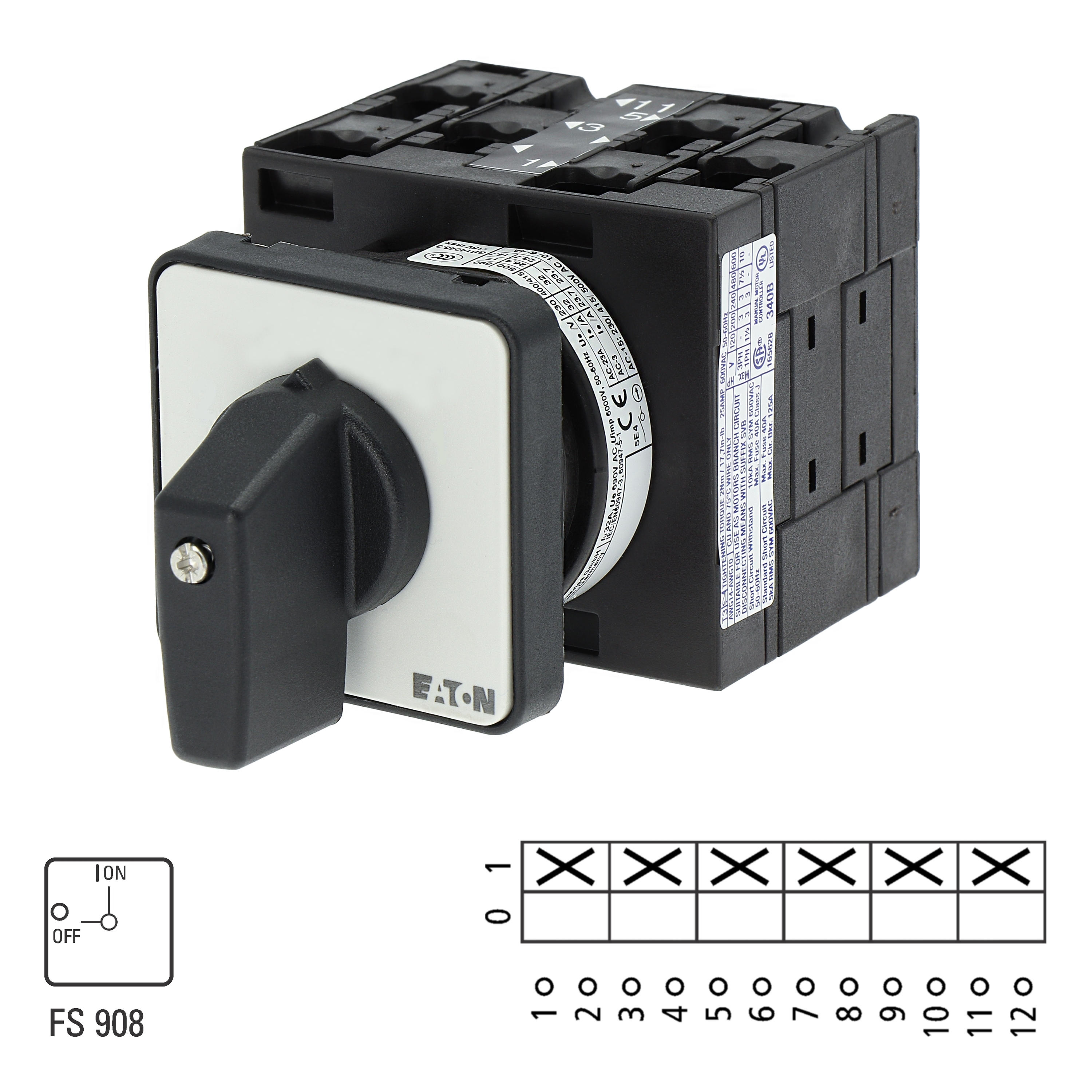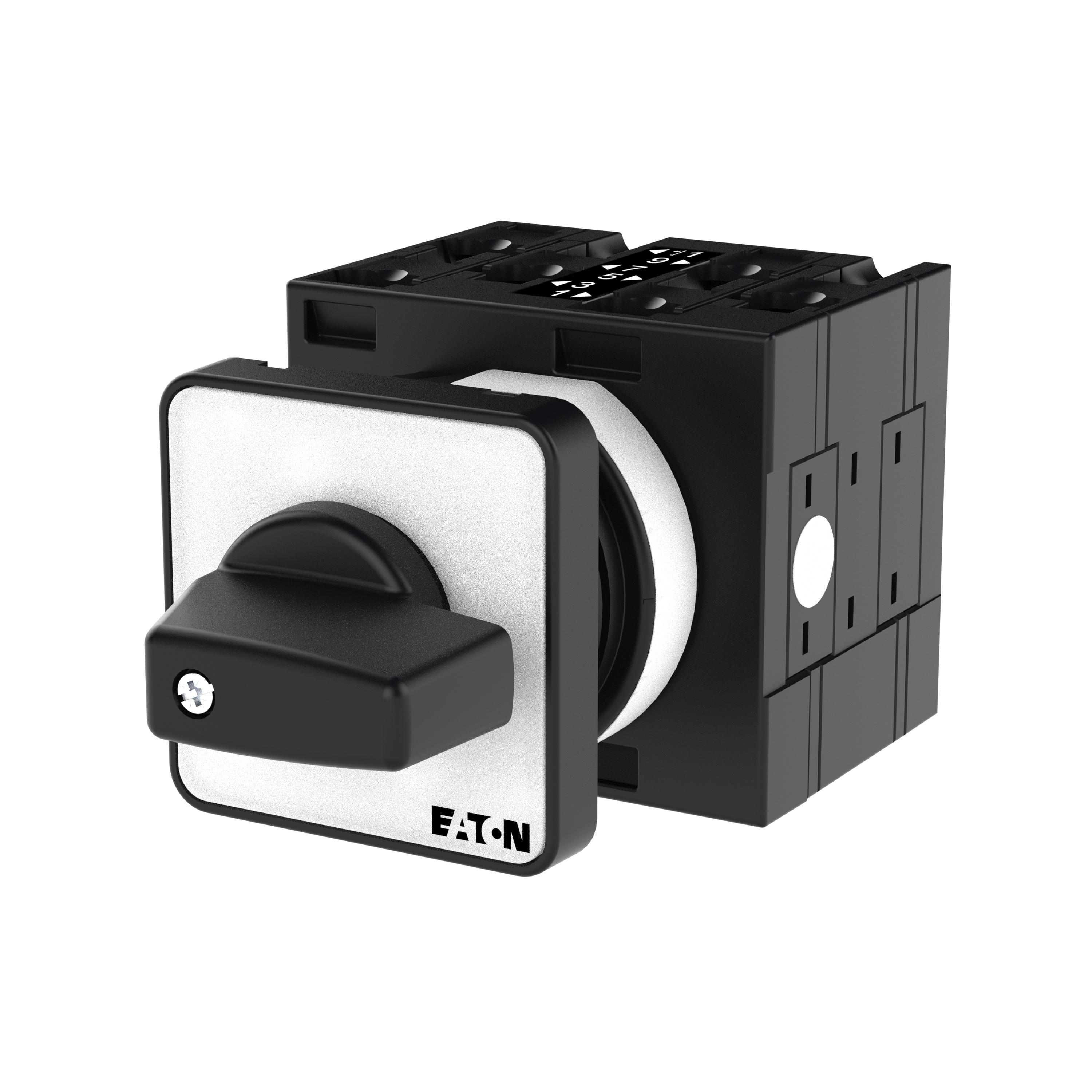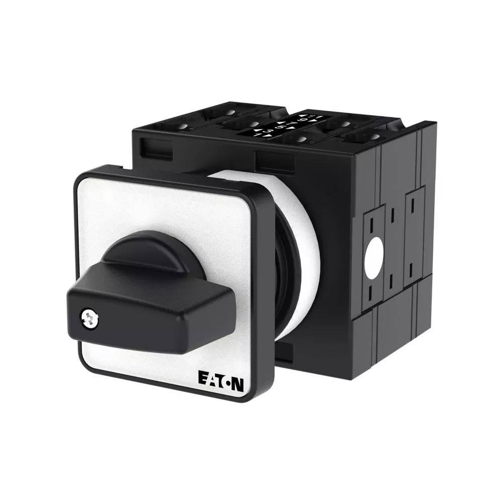 Łącznik krzywkowy wg IEC/EN60947, wielkość konstrukcyjna T3, kształt montażu, tabliczka czołowa 48X48, klasa ochrony na przedzie IP65 z czarnym pokrętłem, pomiarowy prąd stały Iu 32A, znamionowe napięcie pracy Ue 690V, dostępne akcesoria zgodnie z danymi katalogu łączników krzywkowych T