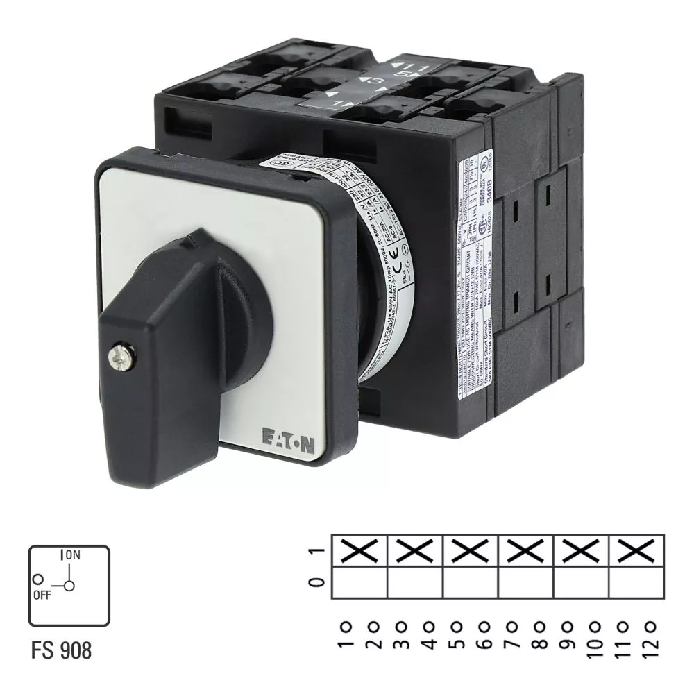T3-3-8342/E Przełącznik Zał.-Wył., 6 bieg., 32 A, 90 °, montaż natablicowy, pokrętło czarne bez możliwości blokady