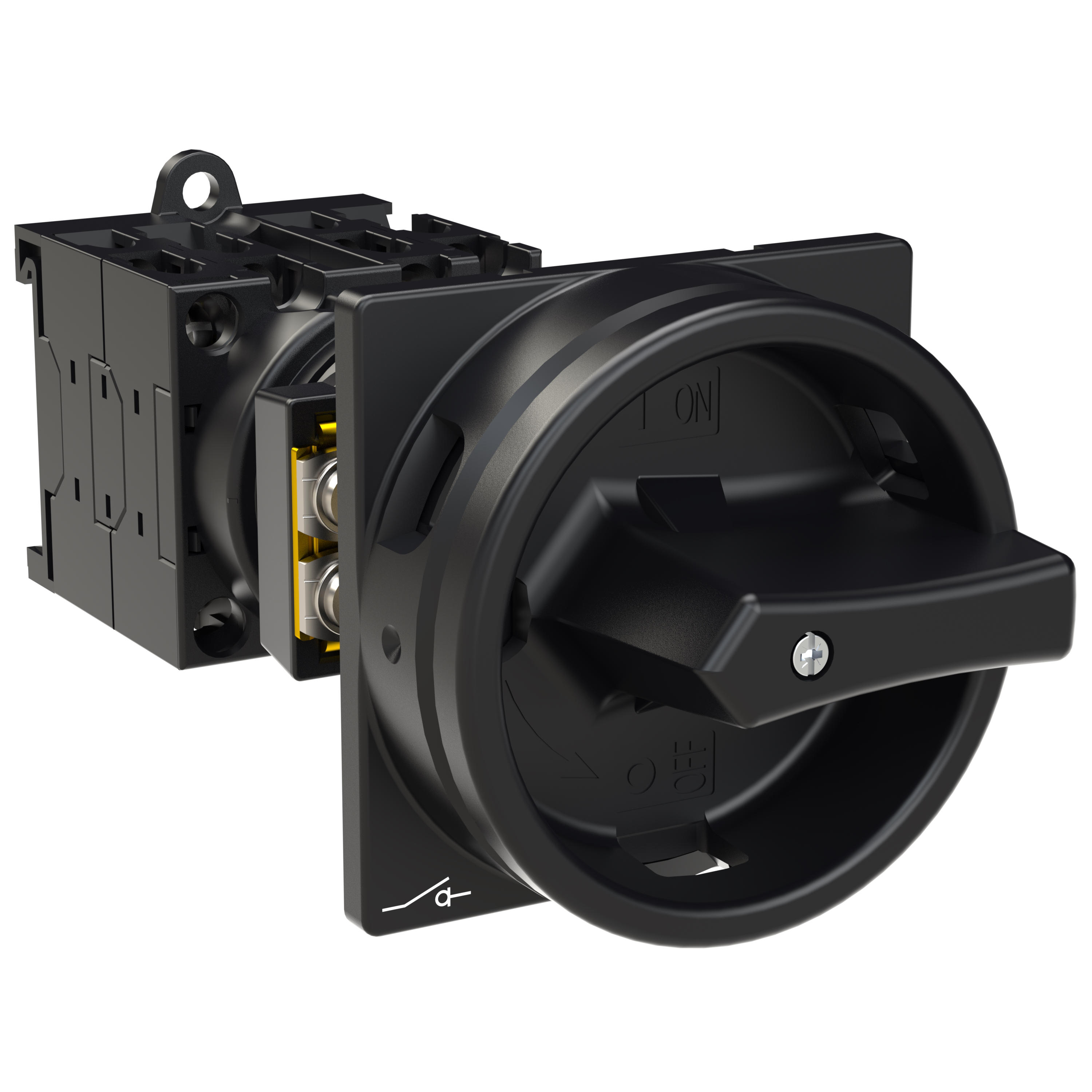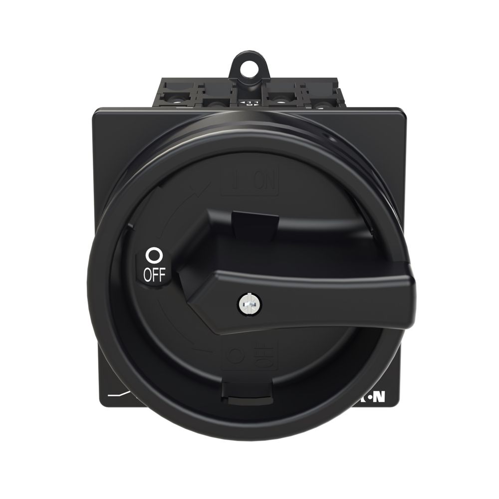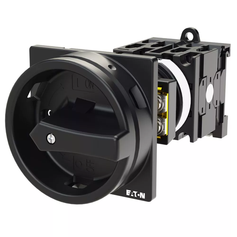 Wyłącznik główny wg IEC/EN60947, wielkość konstrukcyjna T0, konstrukcja pośrednia, klasa ochrony na przedzie IP65 z czarną rękojeścią i wieńcem blokującym zamykanie w położeniu zerowym, pomiarowy prąd stały Iu 20A, znamionowe napięcie pracy Ue 690V, dostępne akcesoria zgodnie z danymi katalogu łączników krzywkowych T. Konstrukcja ogólna: obudowa natynkowa z izolacją, montaż, montaż centralny, montaż pośredni montaż rozdzielacza IVS.
