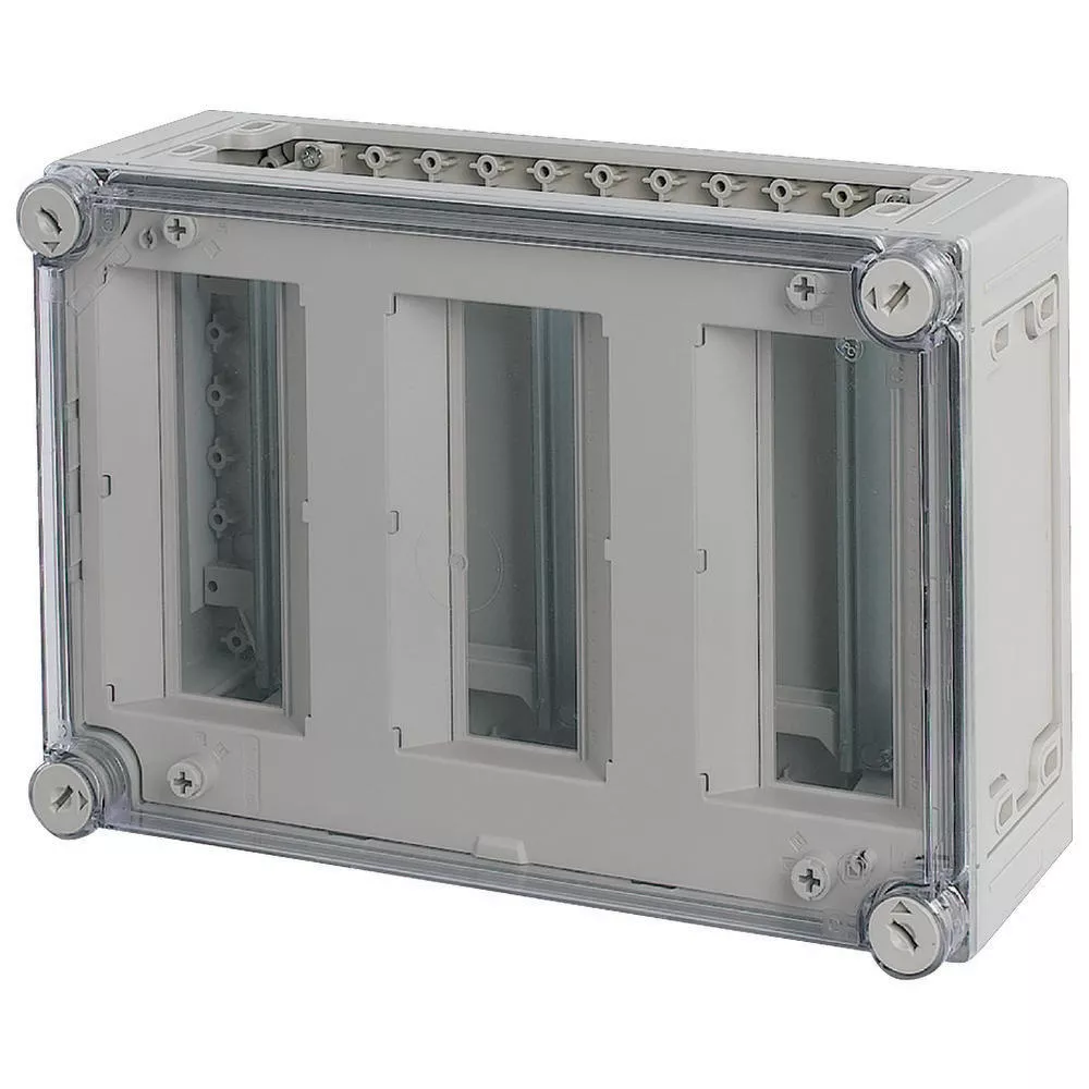 Obudowa dla rozdzielczej aparatury modułowej, opatentowane zamknięcie pokrywy z wbudowanym wyrównaniem nadciśnienia, charakterystyka materiału Poliwęglan (PC), odporność na porażenia, stopień ochrony IP65, ściany boczne zamknięte, wybijana, ściany otwarte na górze i na dole, urządzenia montażowe o rozmiarze 1 zgodnie z DIN 43880, pokrywa przezroczysta z uchwytami do zamykania, szyny nośne do zapinania urządzeń, paski zamykające do nieużywanych miejsc montażowych, pokrywa zabezpieczająca przed dotknięciem z listwami opisowymi, plombowane zamknięcia pokrywy, wersja pokrywy: przezroczysta, wersja części dolnej: zamknięta, wybijana, głębokość=150mm, ilość JC=27