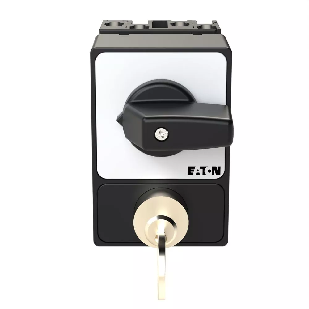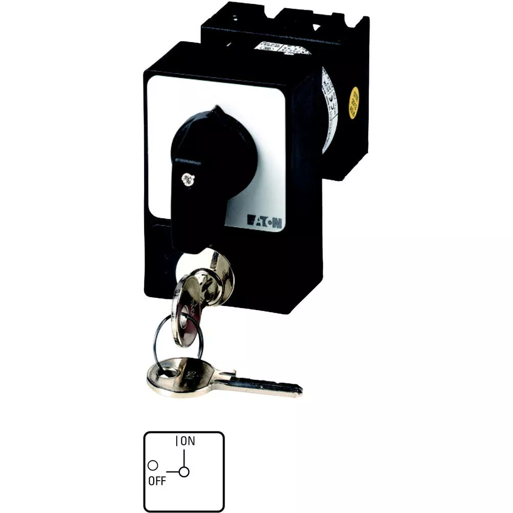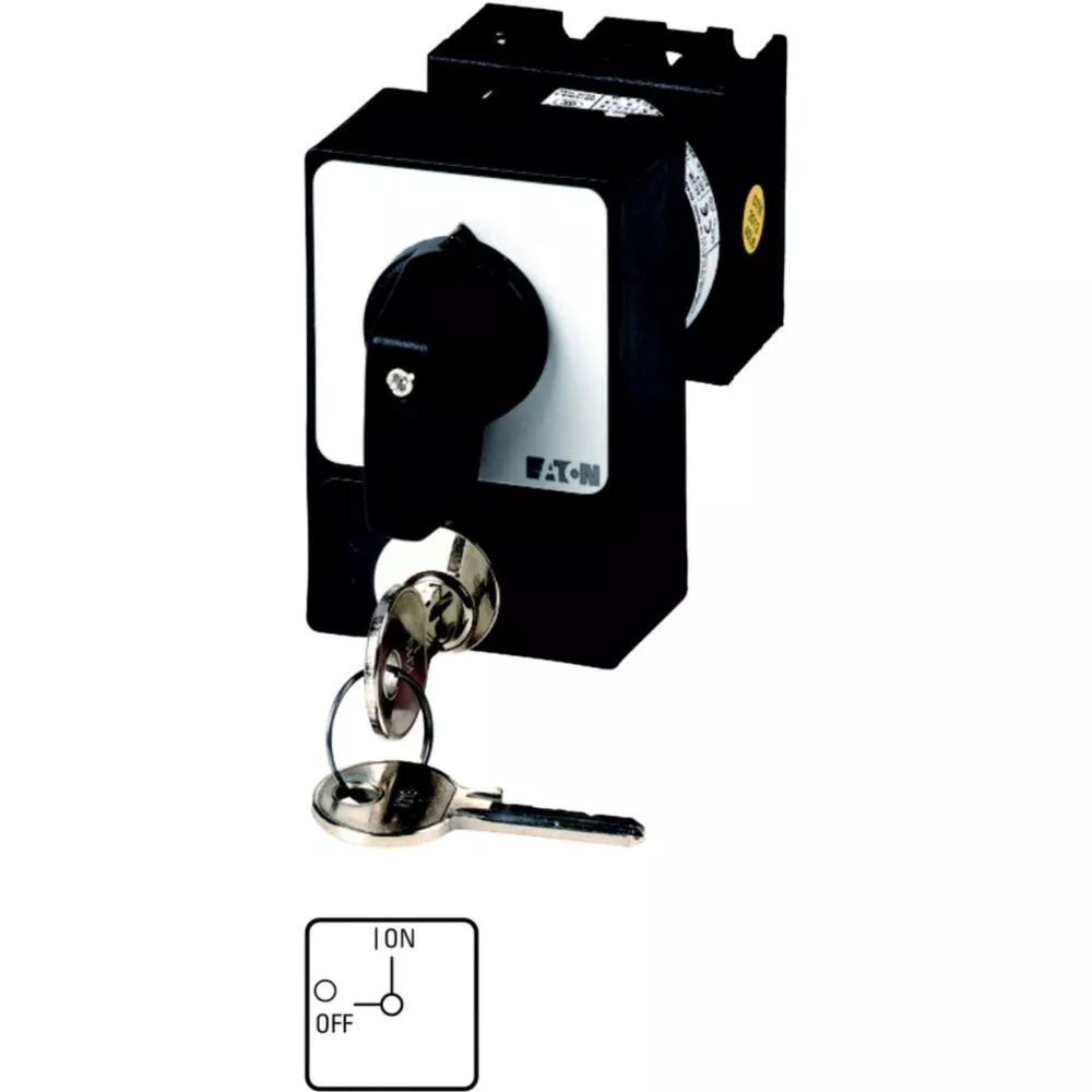 T0-2-1/E/SVA(A) Przełącznik Zał.-Wył., 3 bieg., 20 A, zamek cylindryczny SVA, tabliczka 0-1, 90 °, bez samopowrotu, P, montaż natablicowy, pokrętło czarne z zamkiem cylindrycznym