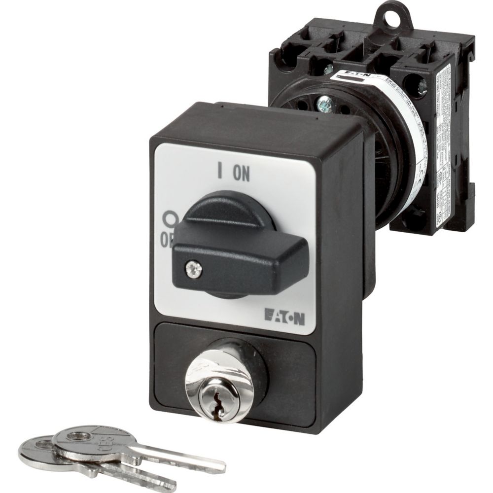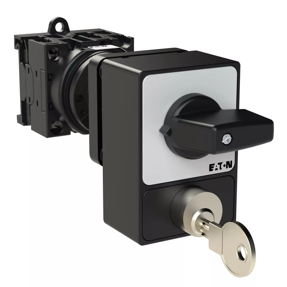 T0-2-1/Z/SVA(A) Przełącznik Zał.-Wył., 3 bieg., 20 A, zamek cylindryczny SVA, tabliczka 0-1, 90 °, bez samopowrotu, P, montaż rozłączny, pokrętło czarne z zamkiem cylindrycznym