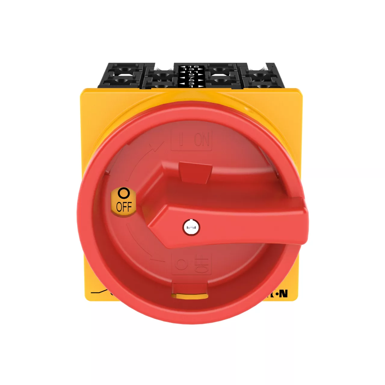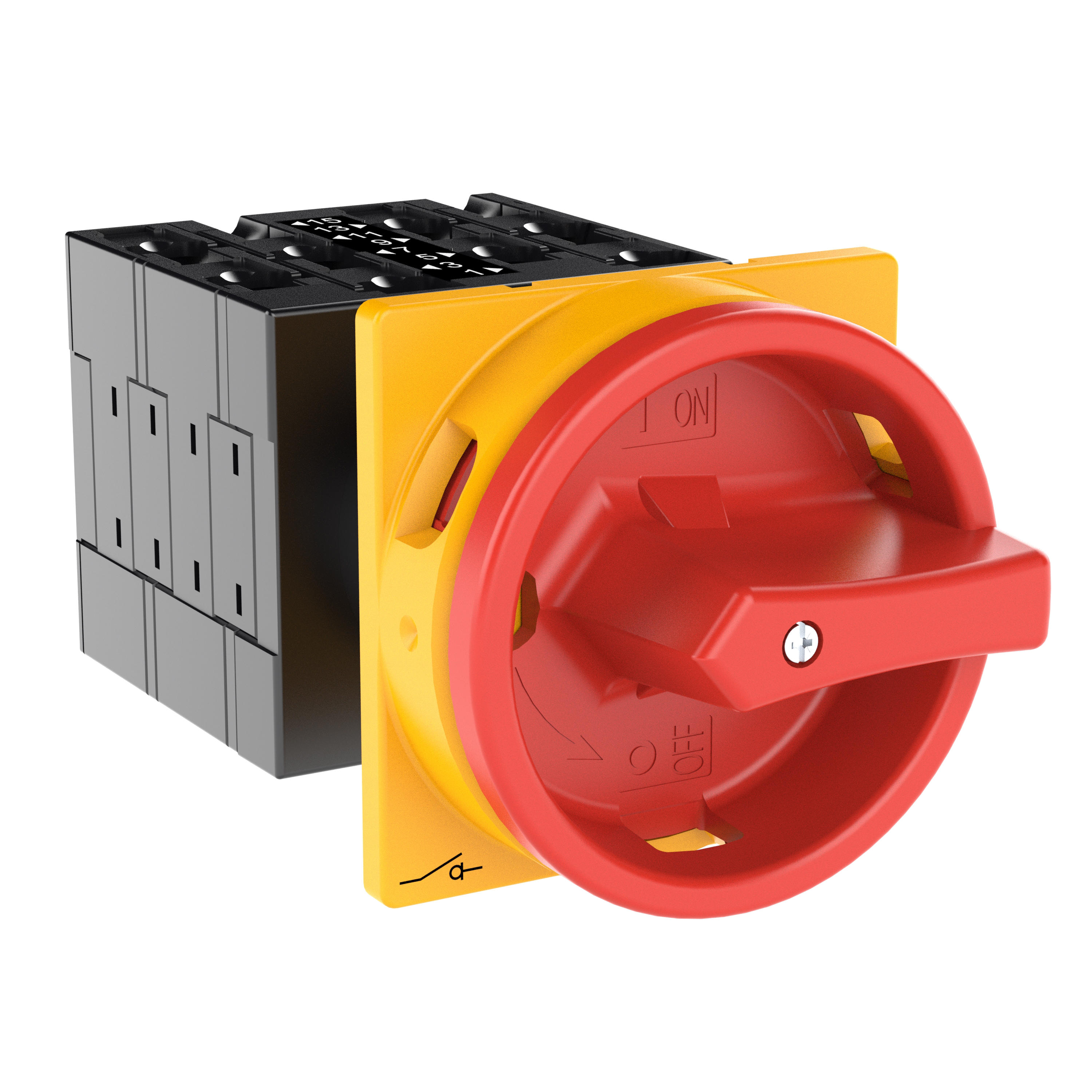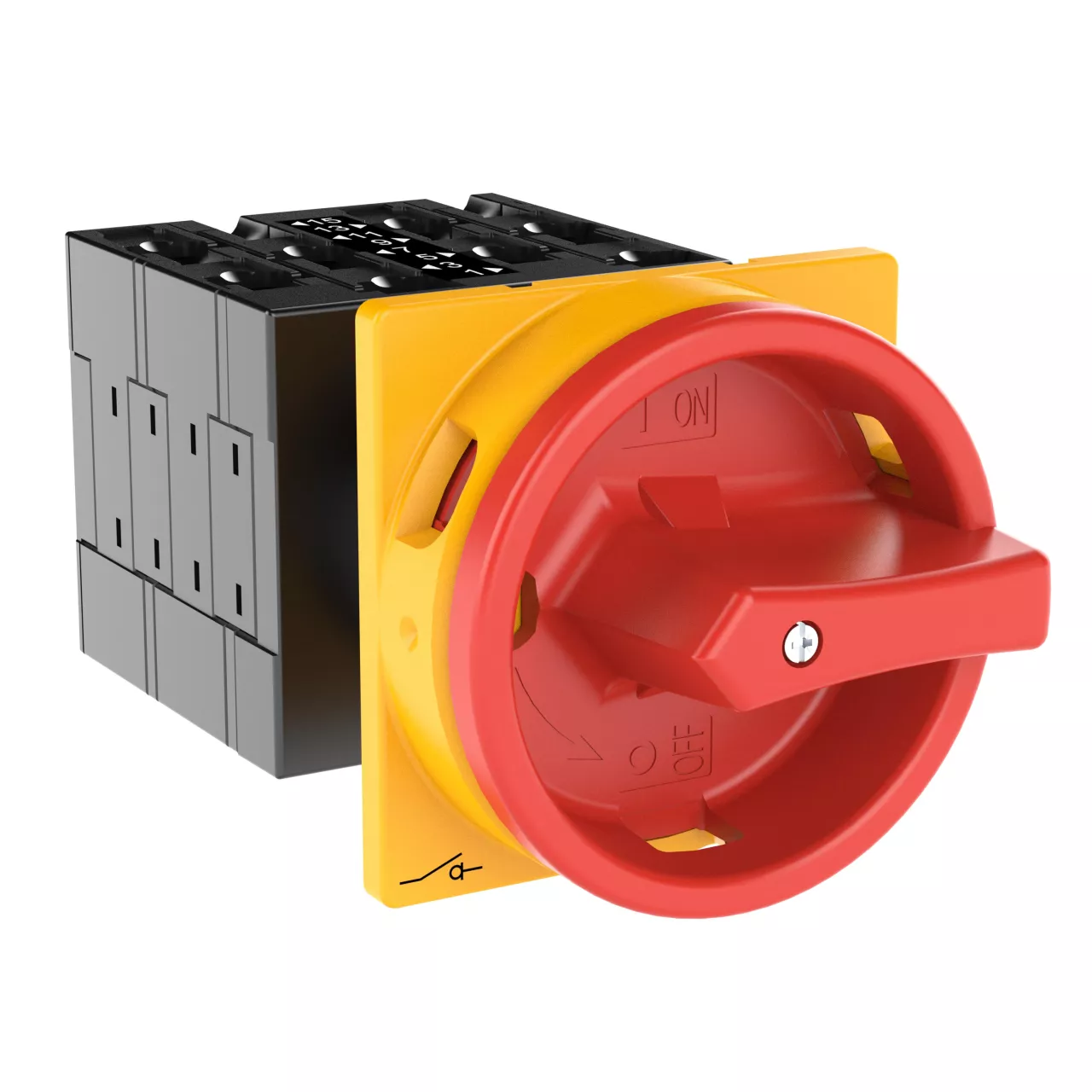 Montażowy wyłącznik główny zgodny z IEC/EN60947, wielkość konstrukcyjna T3, kształt montażu, klasa ochrony na przedzie IP65 z czerwoną rękojeścią i żółtym wieńcem blokującym zamykanie w położeniu zerowym, pomiarowy prąd stały Iu 32A, znamionowe napięcie pracy Ue 690V, dostępne akcesoria zgodnie z danymi katalogu łączników krzywkowych T