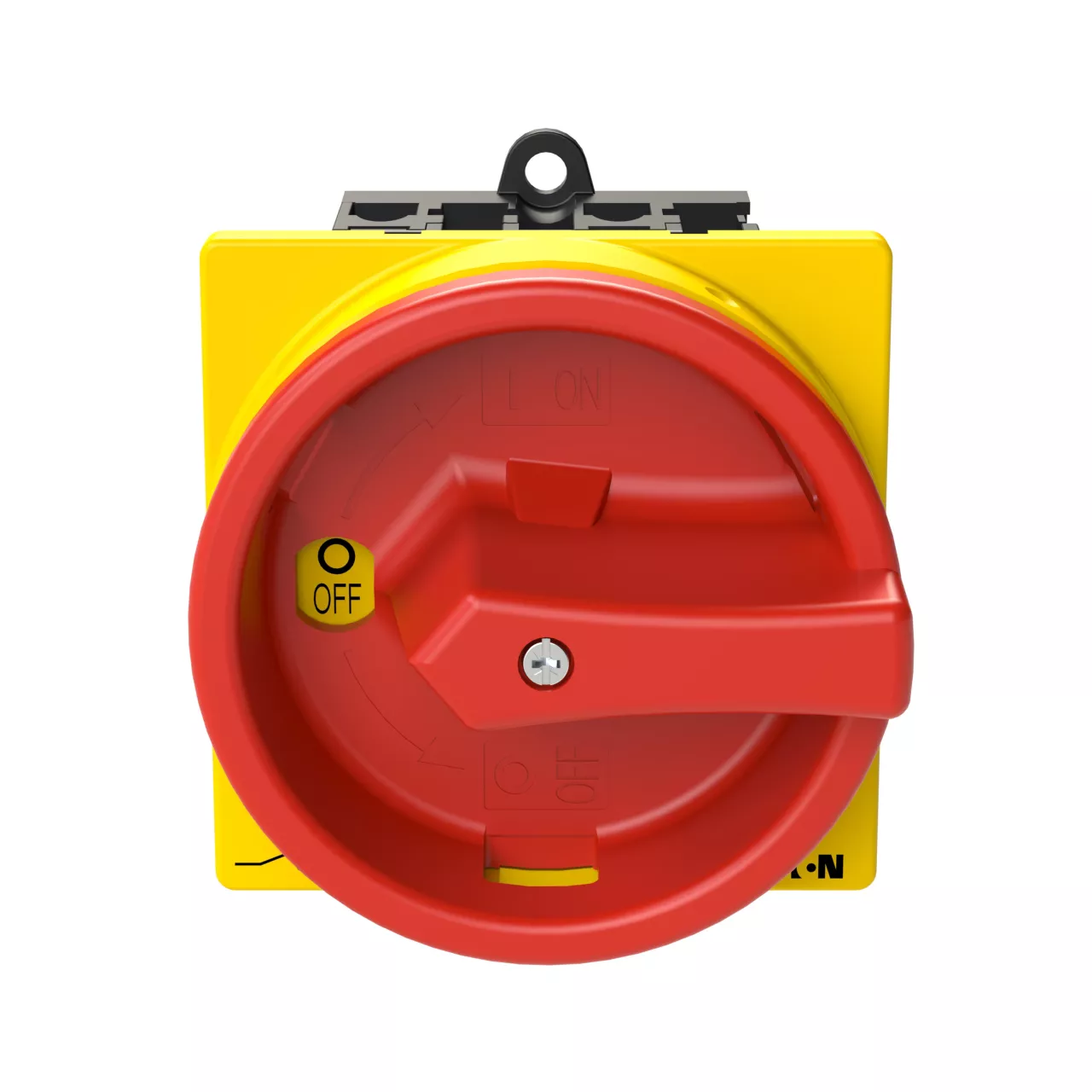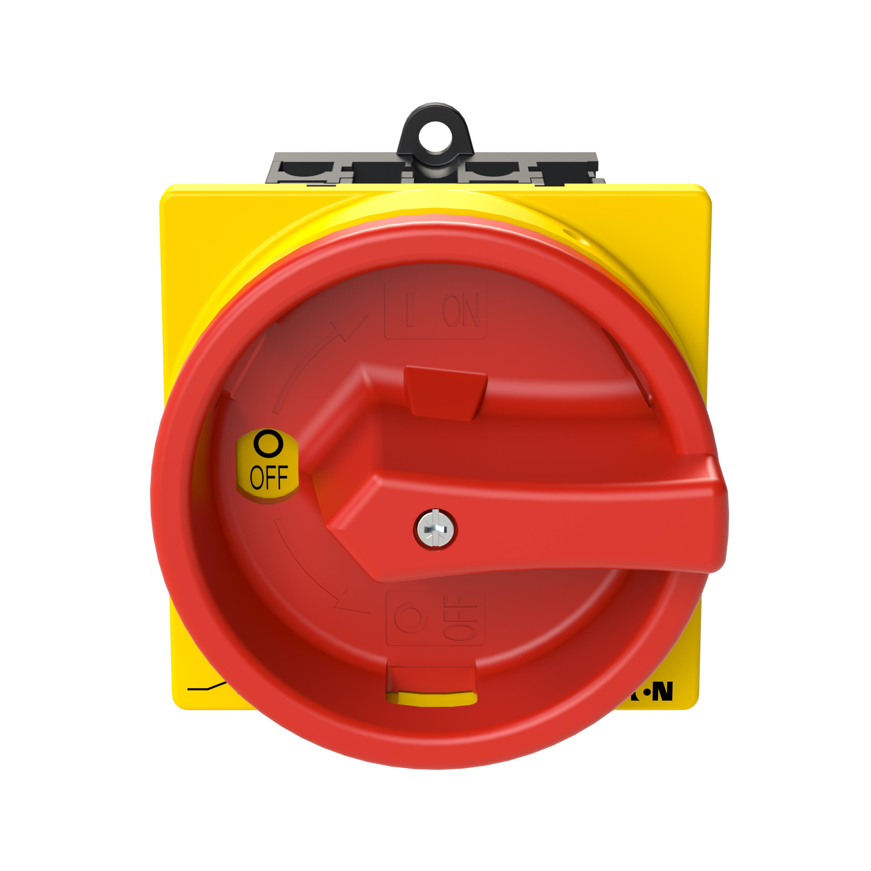 T0-1-8200/V/SVB Rozłącznik główny, 1 bieg., 20 A, funkcja awaryjnego zatrzymania, 90 °, blok. na kłódkę w pozycji Wył., montaż rozłączny, pokrętło czerwono-żółte z blokadą na kłódkę