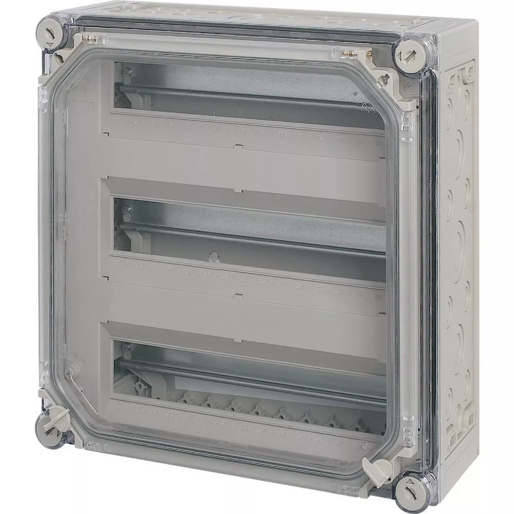 Obudowa dla aparatury modułowej z drzwiami, charakterystyka materiału Poliwęglan (PC), odporność na porażenia, stopień ochrony IP65, metryczne wytłoczenia we wszystkich ścianach bocznych, urządzenia montażowe o rozmiarze 1 zgodnie z DIN 43880, pokrywa przezroczysta z uchwytami do zamykania, drzwi przezroczyste do obsługi wbudowanych urządzeń, szyny nośne do zapinania urządzeń, paski zamykające do nieużywanych miejsc montażowych, pokrywa zabezpieczająca przed dotknięciem z listwami opisowymi, z szynami PE/N, łączniki mocujące do uchwytu ściennego, plombowane zamknięcia pokrywy, ilość JC=45, zaciski PE i N Liczbaxprzekrój 4x(6-35)mm² i 20x(1-4)mm², wersja pokrywy: przezroczysta, wersja drzwi: przezroczysta