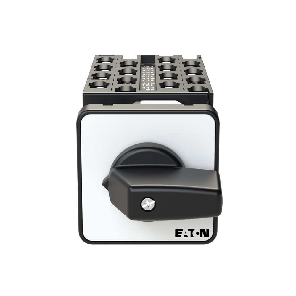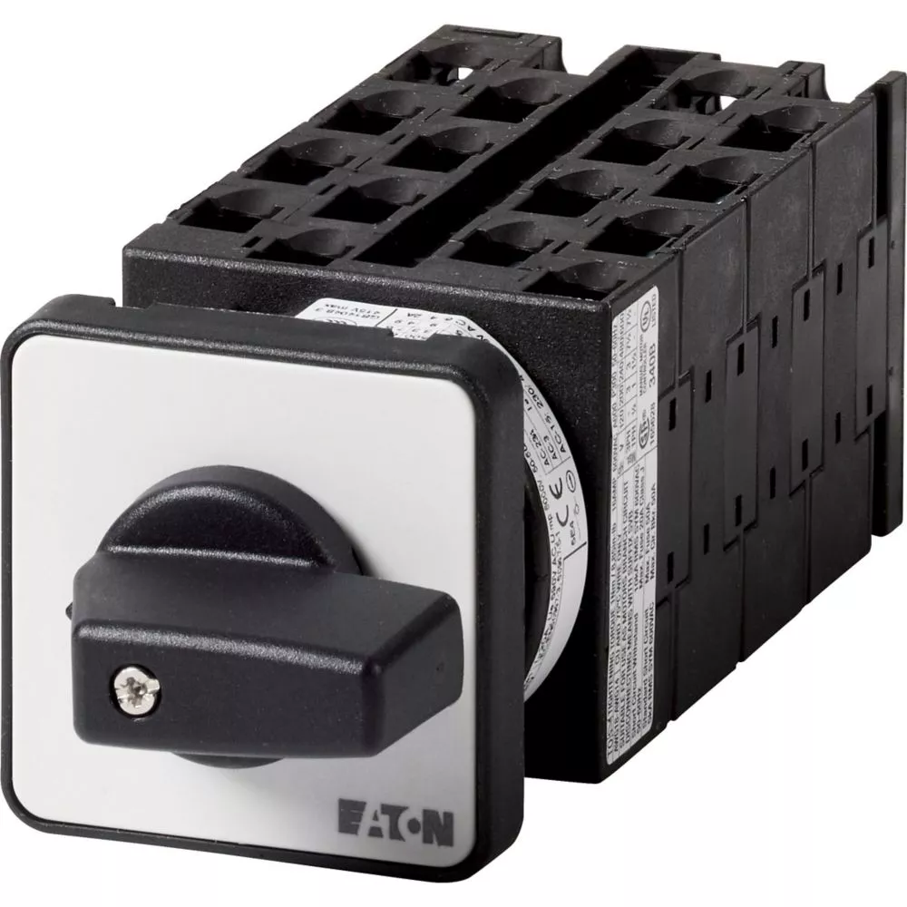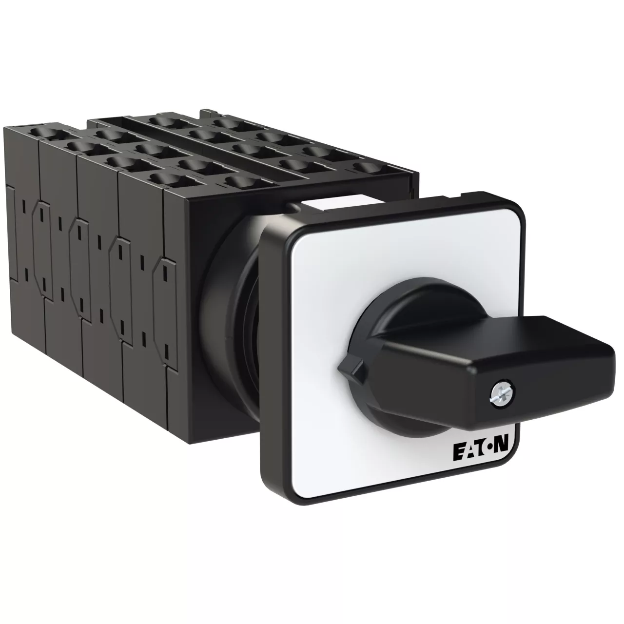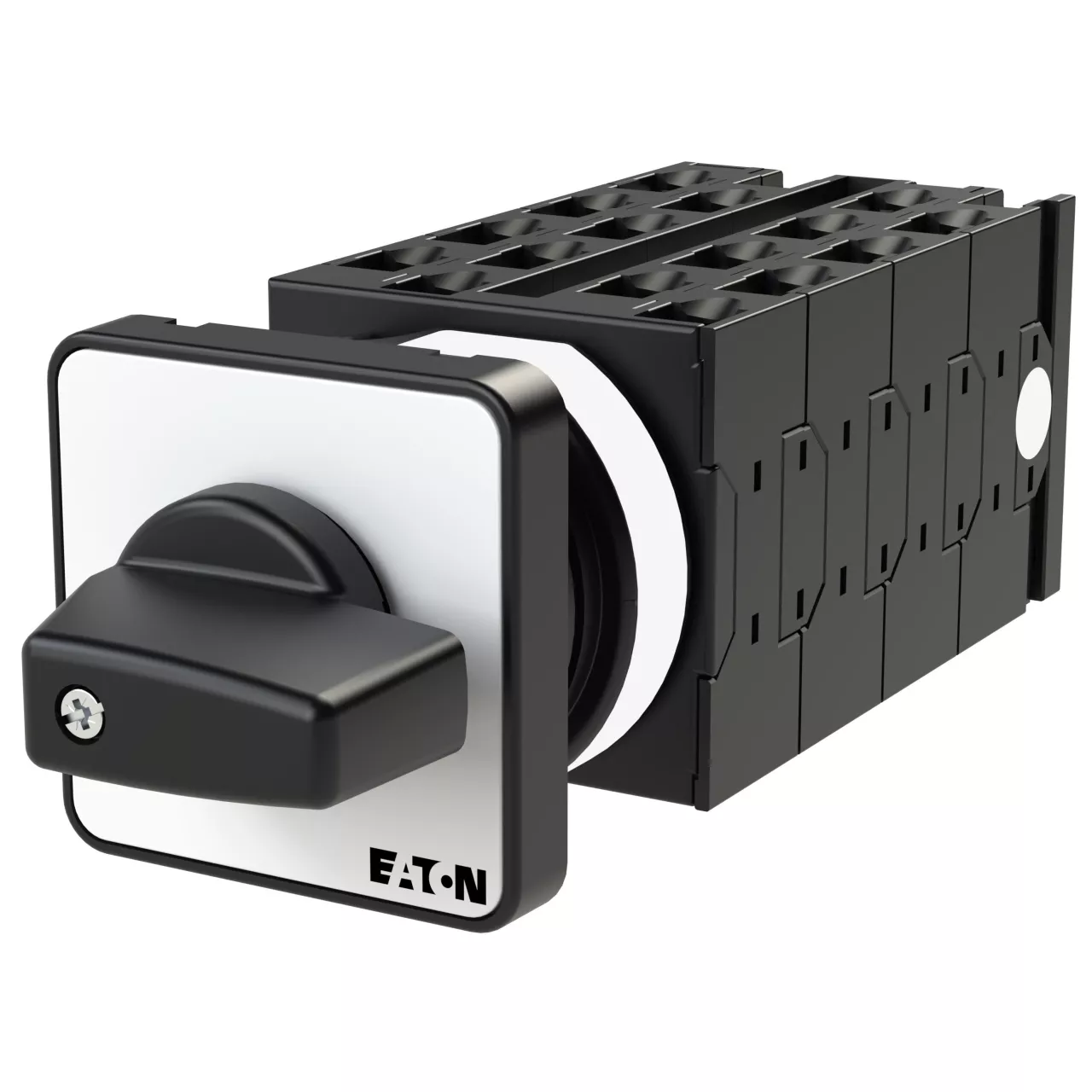 Łącznik krzywkowy wg IEC/EN60947, wielkość konstrukcyjna T0, kształt montażu, tabliczka czołowa 48X48, klasa ochrony na przedzie IP65 z czarnym pokrętłem, pomiarowy prąd stały Iu 20A, znamionowe napięcie pracy Ue 690V, dostępne akcesoria zgodnie z danymi katalogu łączników krzywkowych T. Konstrukcja ogólna: obudowa natynkowa z izolacją, montaż, montaż centralny, montaż pośredni montaż rozdzielacza IVS.