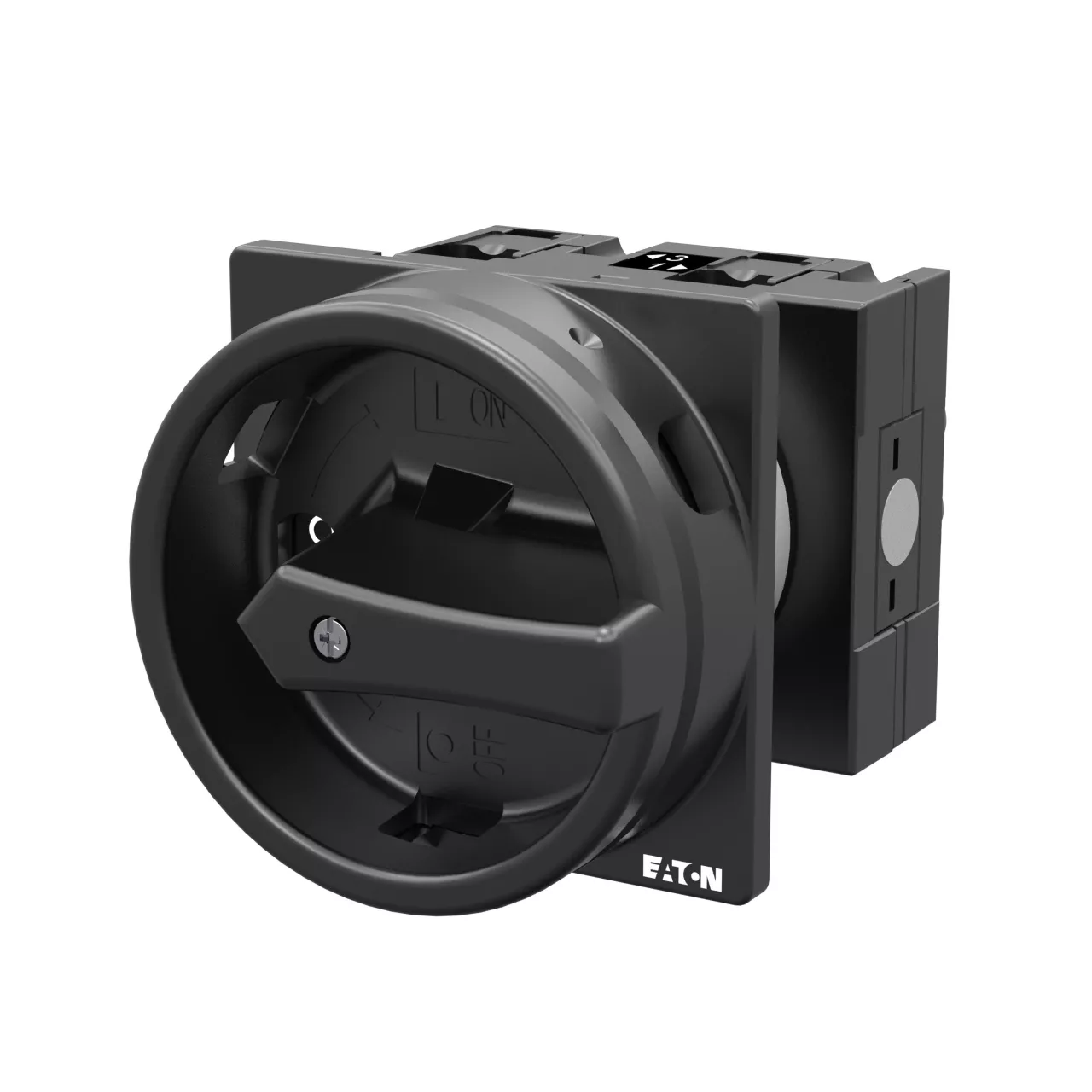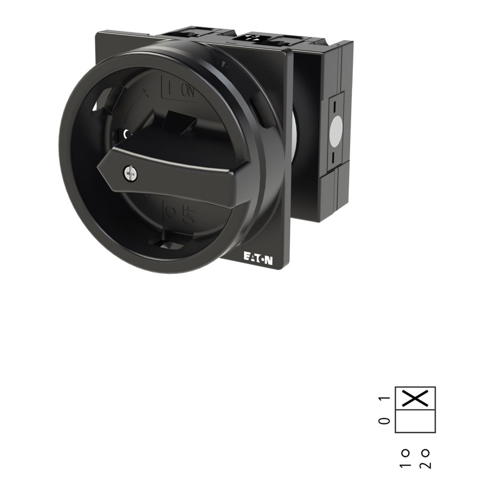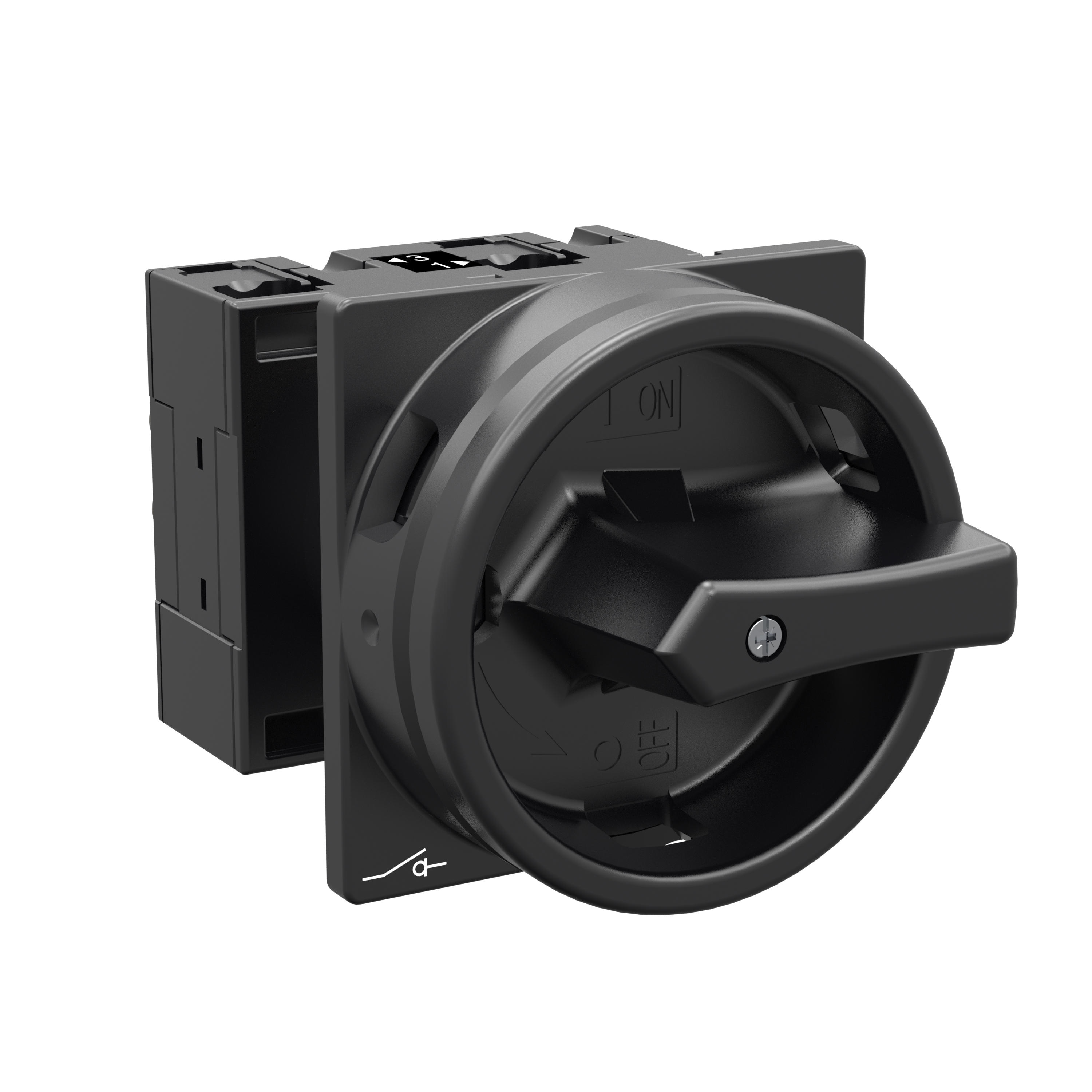Montażowy wyłącznik główny zgodny z IEC/EN60947, wielkość konstrukcyjna T3, kształt montażu, klasa ochrony na przedzie IP65 z czarną rękojeścią i wieńcem blokującym zamykanie w położeniu zerowym, pomiarowy prąd stały Iu 32A, znamionowe napięcie pracy Ue 690V, dostępne akcesoria zgodnie z danymi katalogu łączników krzywkowych T