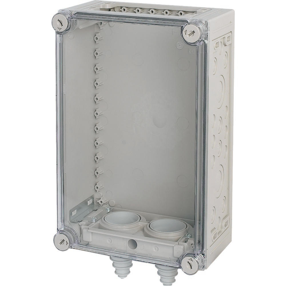 Pusta obudowa rozdzielacza z zamontowanymi wspornikami kablowymi, charakterystyka materiału Poliwęglan (PC), odporność na porażenia, stopień ochrony IP65, opatentowane zamknięcie pokrywy z wbudowanym wyrównaniem nadciśnienia, ściany boczne zamknięte, wybijana, ściany otwarte na górze lub na dole, przewody wkładane od przodu przez dzielone zaciski kablowe, plombowane zamknięcia pokrywy, RAL 7032, piaskowa (skrzynia dolna), przezroczysta, bezbarwna (pokrywa), głębokość montażu przy płyci montażowej=125mm, wersja pokrywy: przezroczysta, wersja części dolnej: na górze otwarta na dole króciec kablowy