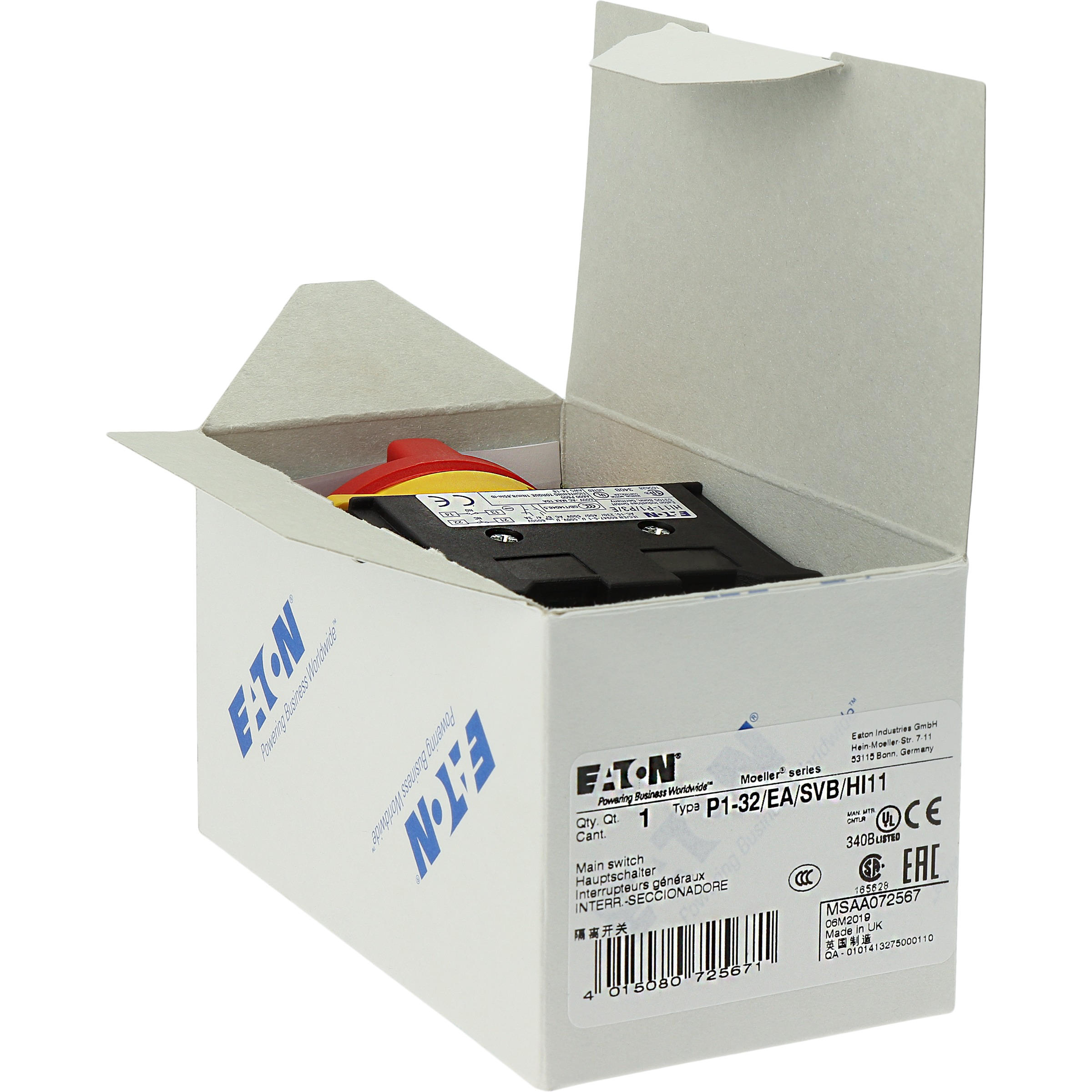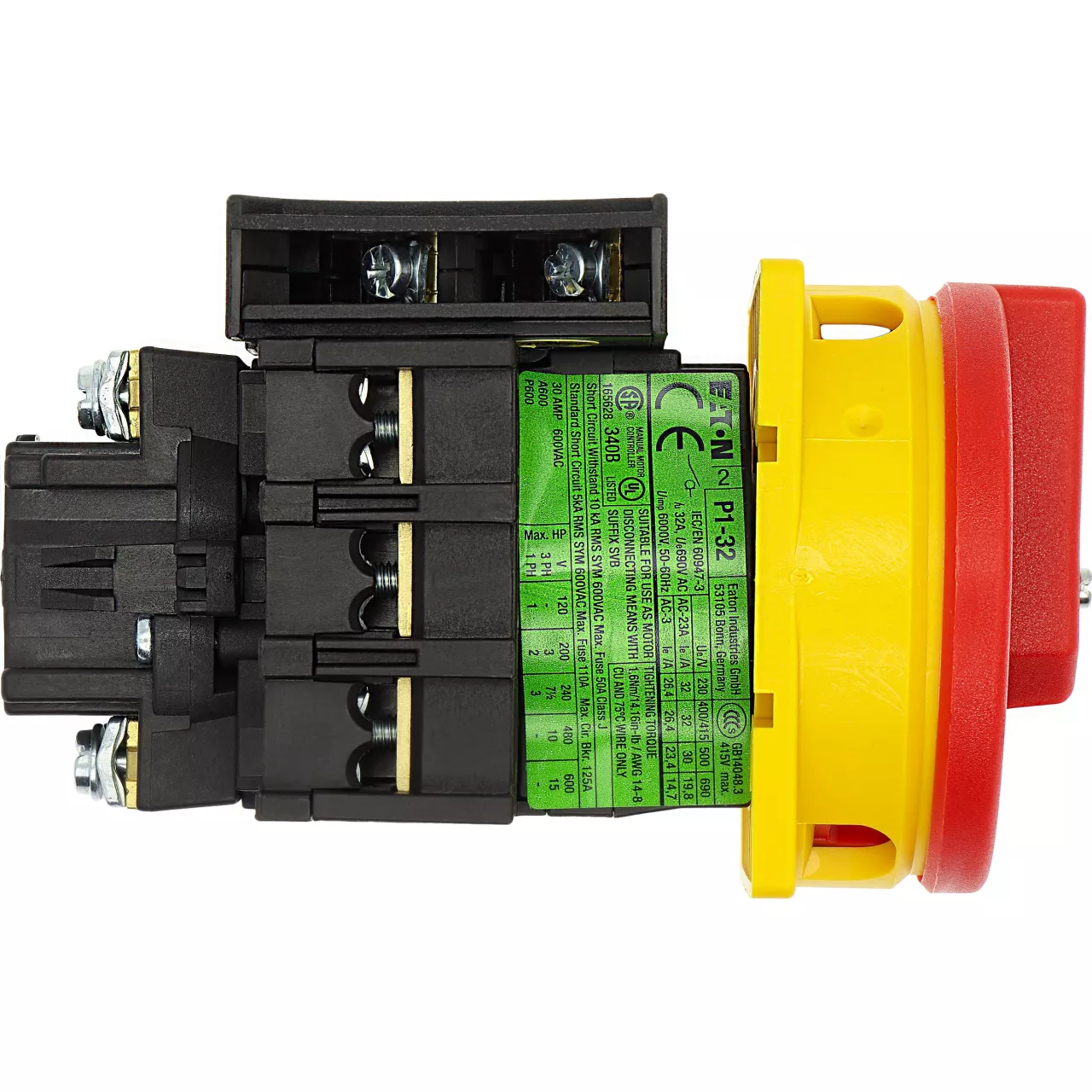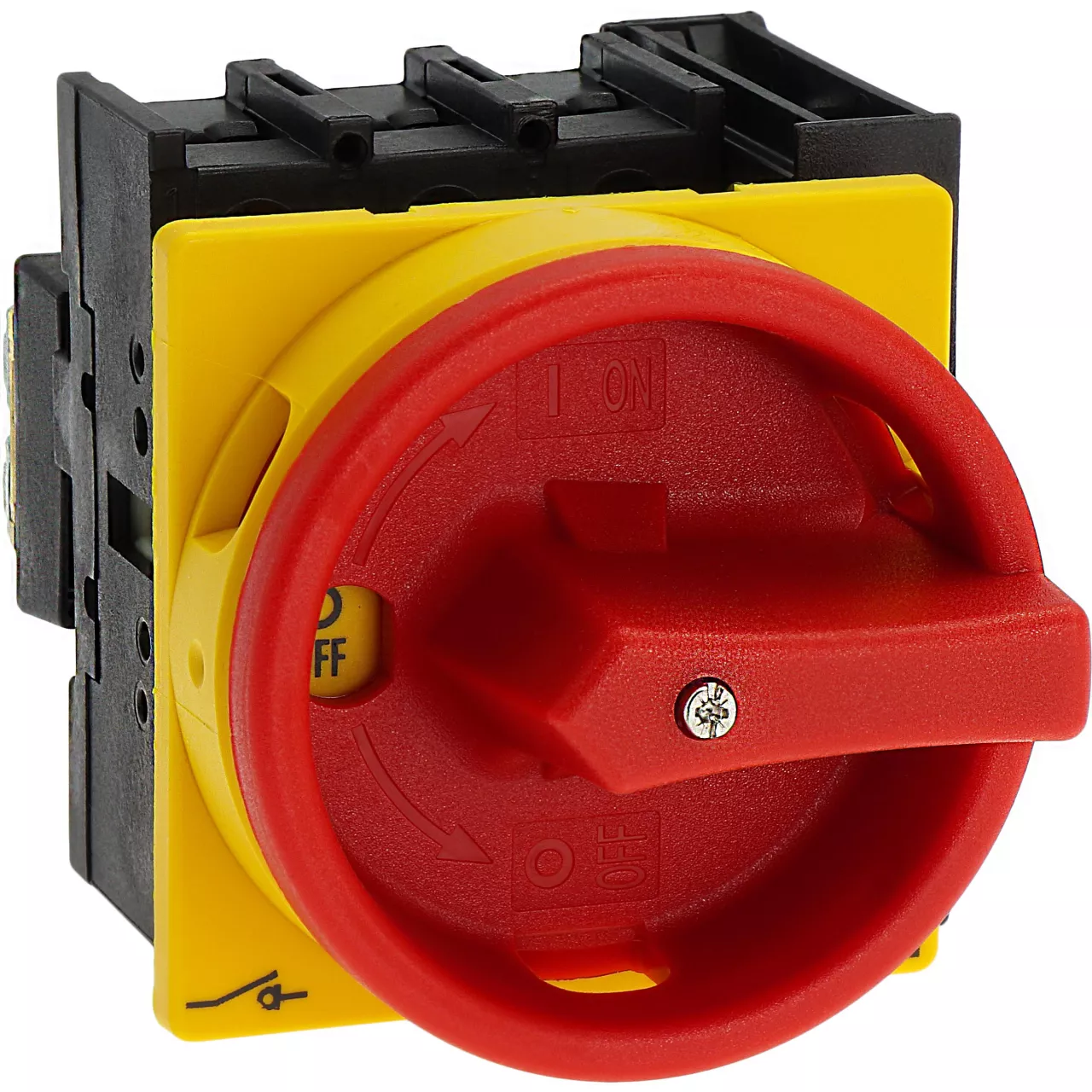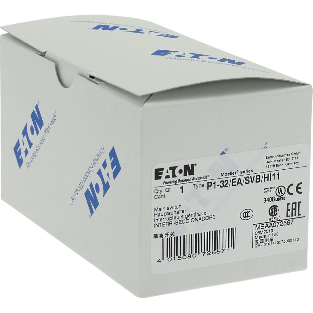 Rozłącznik główny / rozłącznik izolacyjny wł./wył. wg IEC/EN 60947-3, 690V/32A, klasa ochrony przód IP65, rękojeść czerwona z wieńcem blokującym żółtym, zamykanie 3 kłódkami, rozłączniki izolacyjne P1 mają niewielkie wymiary i solidną konstrukcję. Napęd ręczny działa bezpośrednio na zestyki. Zestyki po wyłączeniu rozwierają się w sposób wymuszony.. Ogólne konstrukcje: obudowa natynkowa z izolacją, montaż, montaż centralny, montaż pośredni, montaż rozdzielacza IVS