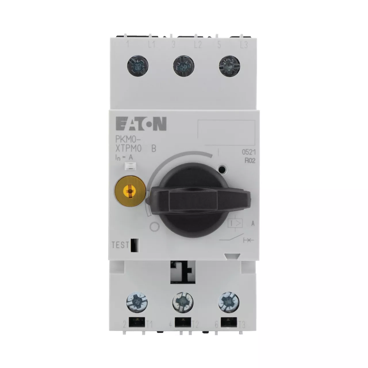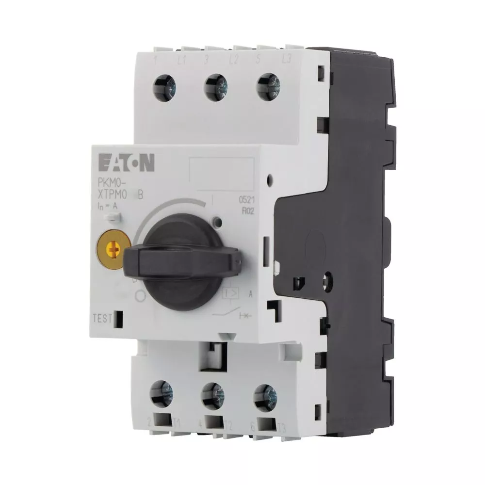 Wyłącznik silnikowy zgodny z IEC/EN60947, 3-biegunowe wielkość konstrukcyjna PKM0, z wyzwalaczem zwarciowym bez opóźnienia, mocowanie na śruby i zaciski, Z zaciskami ze śrubą, wymiary montażowe zatyczki 45mm, znamionowe napięcie pracy Ue 690V, stopień ochrony IP20, zabezpieczenie przed dotknięciem zgodnie z VDE 0106 cz. 100, dostępne akcesoria: łącznik pomocniczy, wyzwalacz napięcia, napęd sterujący, płyta wczepiana