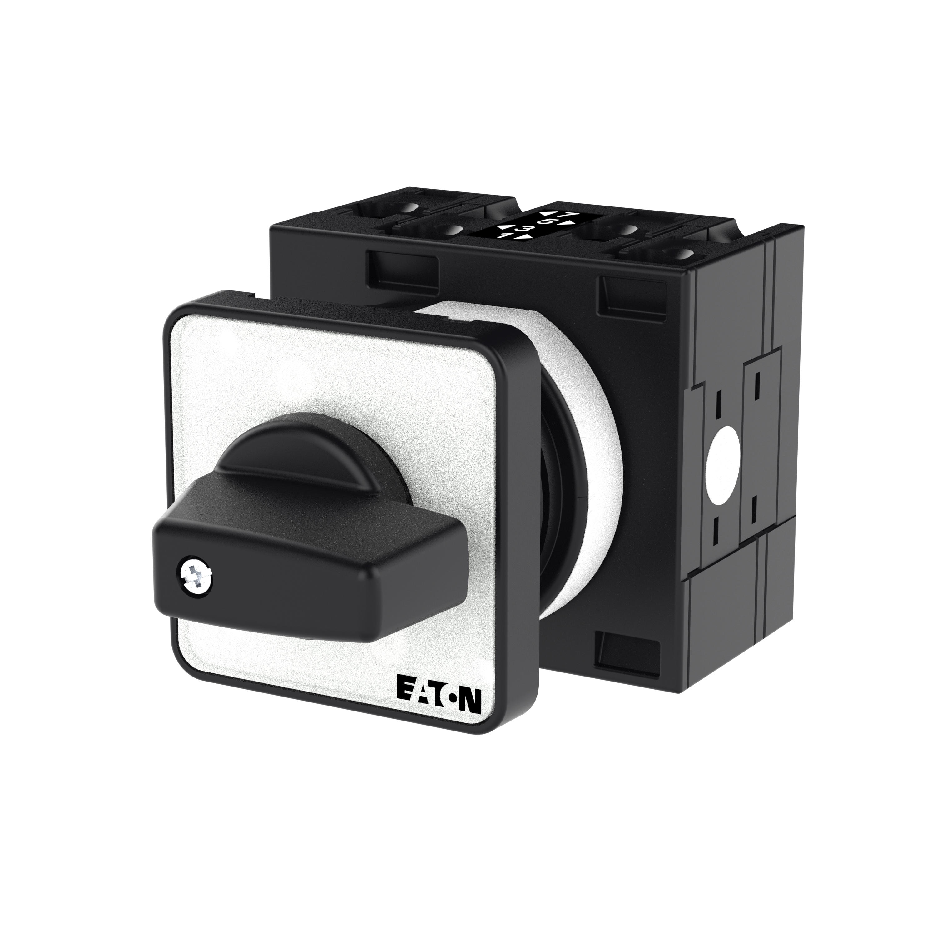 Łącznik krzywkowy wg IEC/EN60947, wielkość konstrukcyjna T3, kształt montażu, tabliczka czołowa 48X48, klasa ochrony na przedzie IP65 z czarnym pokrętłem, pomiarowy prąd stały Iu 32A, znamionowe napięcie pracy Ue 690V, dostępne akcesoria zgodnie z danymi katalogu łączników krzywkowych T