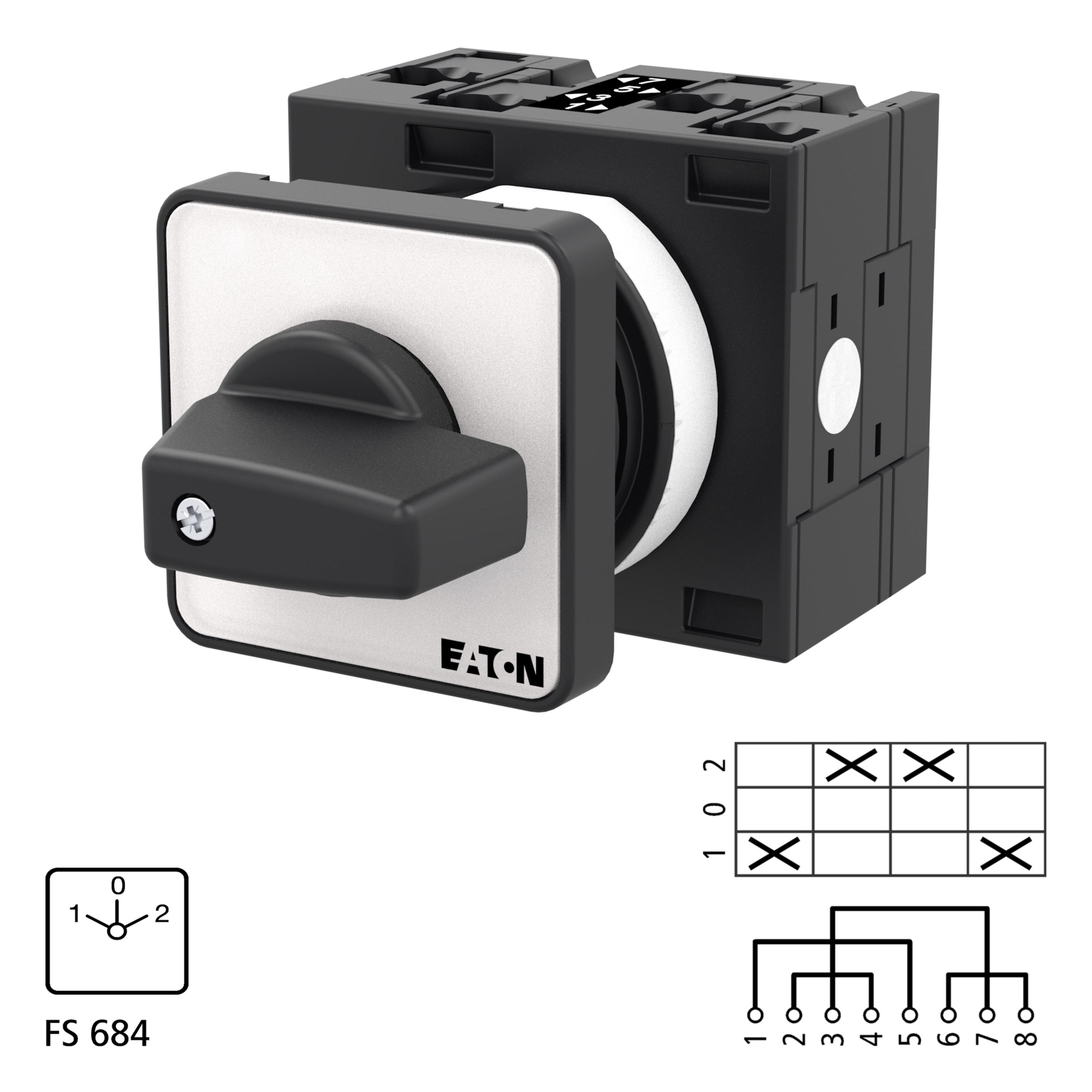 T3-2-8400/E Przełącznik nawrotny, Styki: 4, 32 A, tabliczka: 1-0-2, 45 °, bez samopowrotu, montaż natablicowy, pokrętło czarne bez możliwości blokady