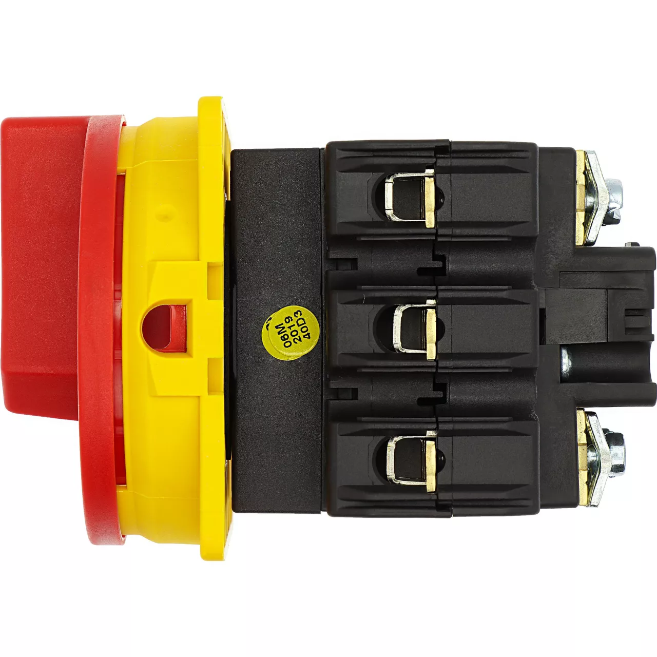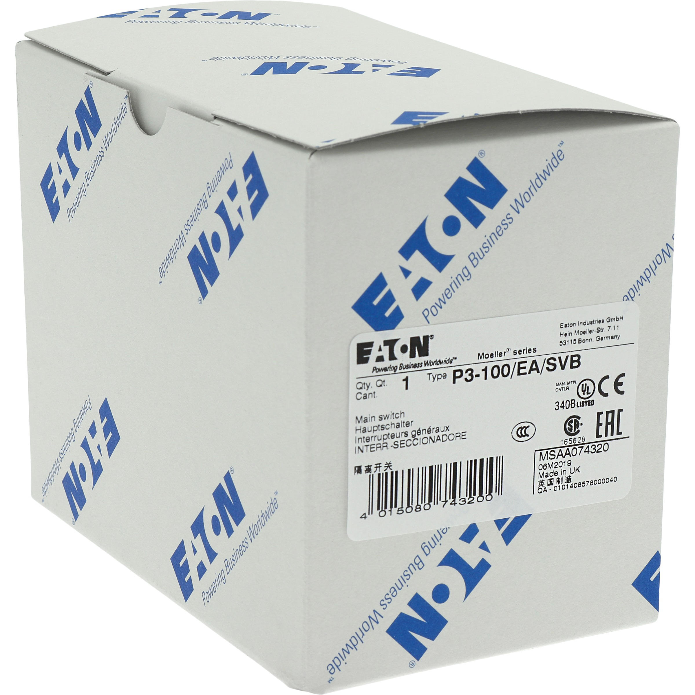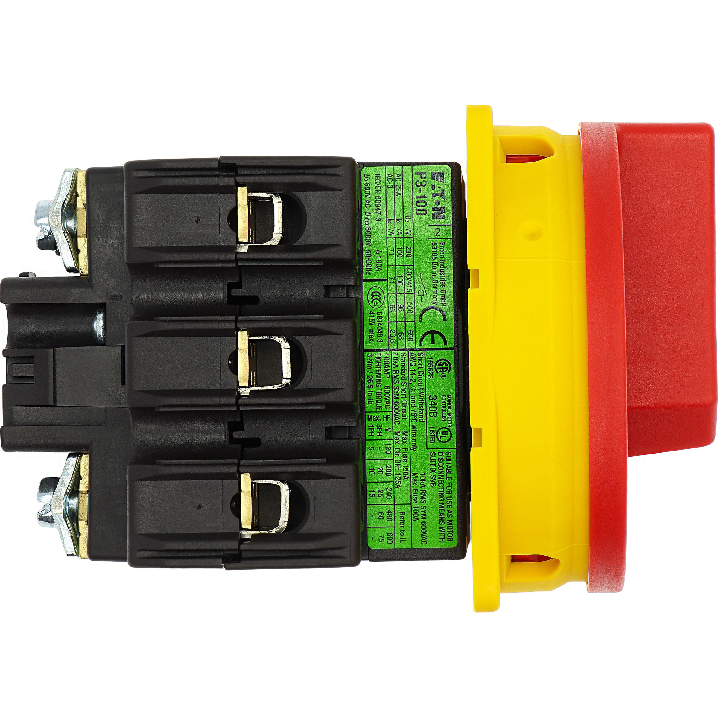 P3-100/EA/SVB Rozłącznik główny, 3 bieg., 100 A, funkcja awaryjnego zatrzymania, blok. na kłódkę w pozycji Wył., montaż natablicowy, pokrętło czerwono-żółte z blokadą na kłódkę