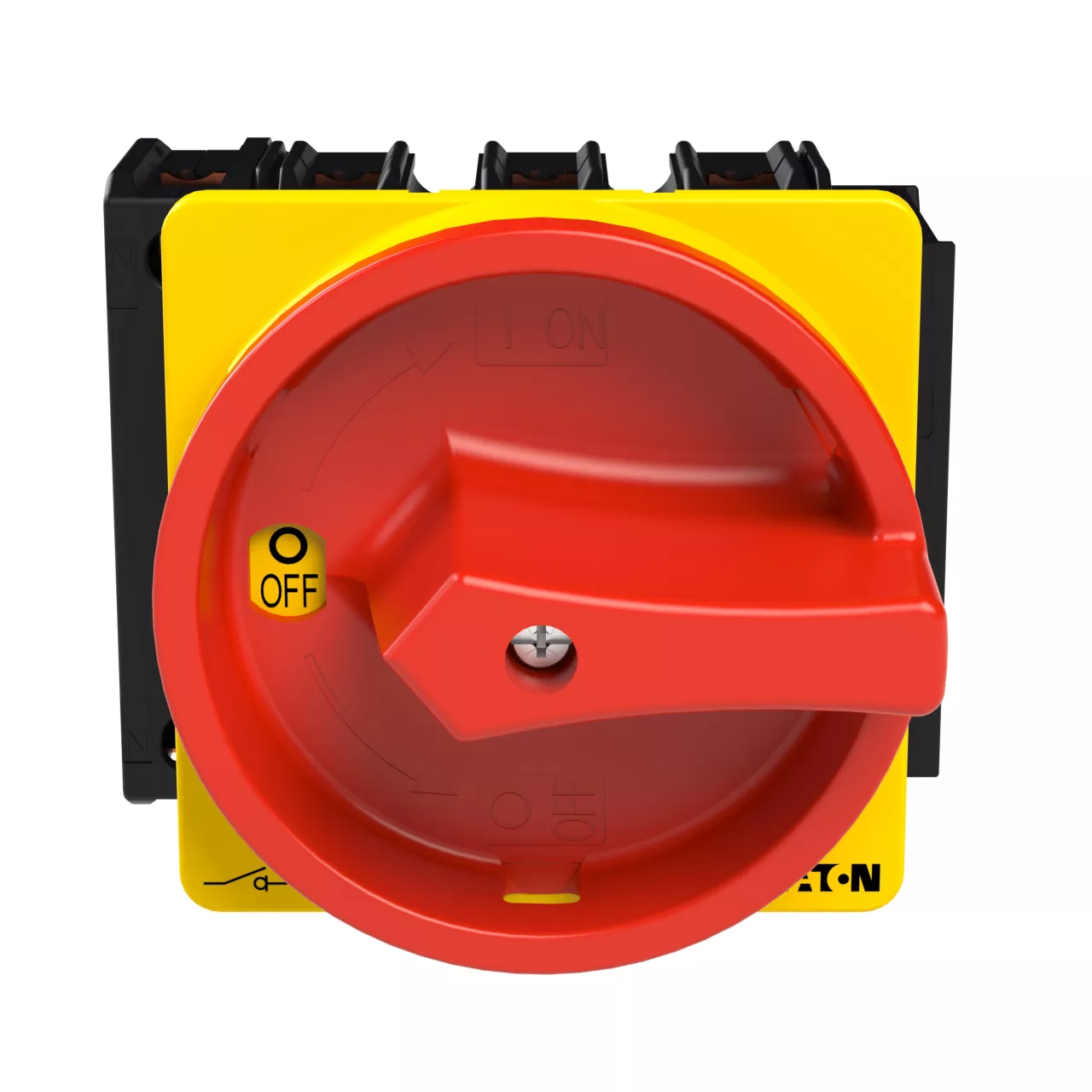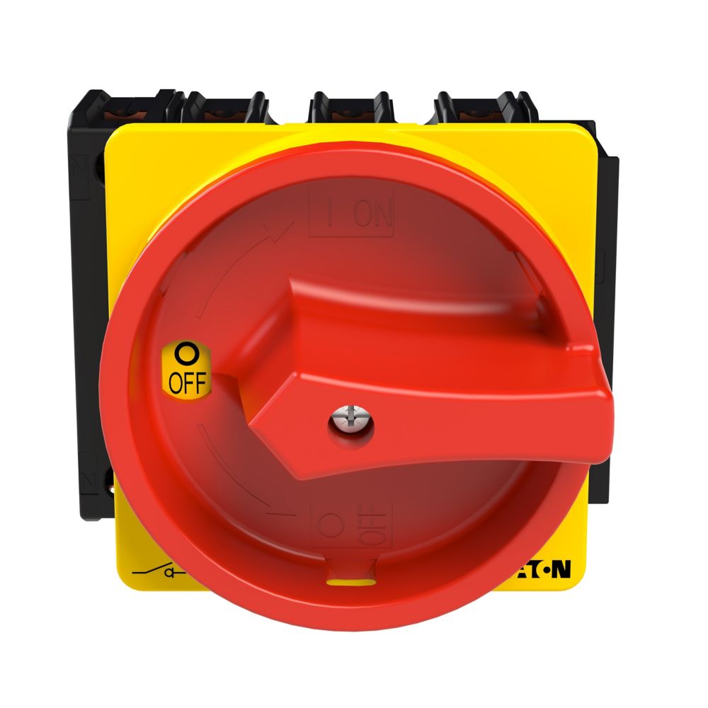 P3-100/EA/SVB/N/HI11 Rozłącznik główny, 3 bieg. + N + 1 NO + 1 NC, 100 A, funkcja awaryjnego zatrzymania, blok. na kłódkę w pozycji Wył., montaż natablicowy, pokrętło czerwono-żółte z blokadą na kłódkę
