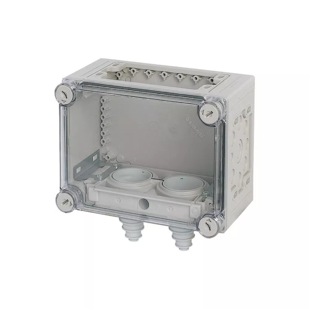Pusta obudowa rozdzielacza z zamontowanymi wspornikami kablowymi, charakterystyka materiału Poliwęglan (PC), odporność na porażenia, stopień ochrony IP65, opatentowane zamknięcie pokrywy z wbudowanym wyrównaniem nadciśnienia, ściany boczne zamknięte, wybijana, ściany otwarte na górze lub na dole, przewody wkładane od przodu przez dzielone zaciski kablowe, plombowane zamknięcia pokrywy, RAL 7032, piaskowa (skrzynia dolna), przezroczysta, bezbarwna (pokrywa), głębokość montażu przy płyci montażowej=125mm, wersja pokrywy: przezroczysta, wersja części dolnej: na górze otwarta na dole króciec kablowy