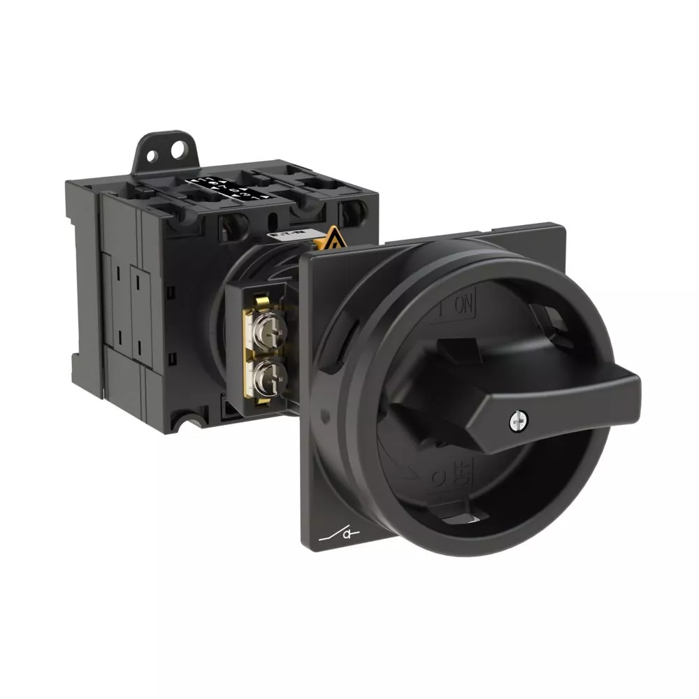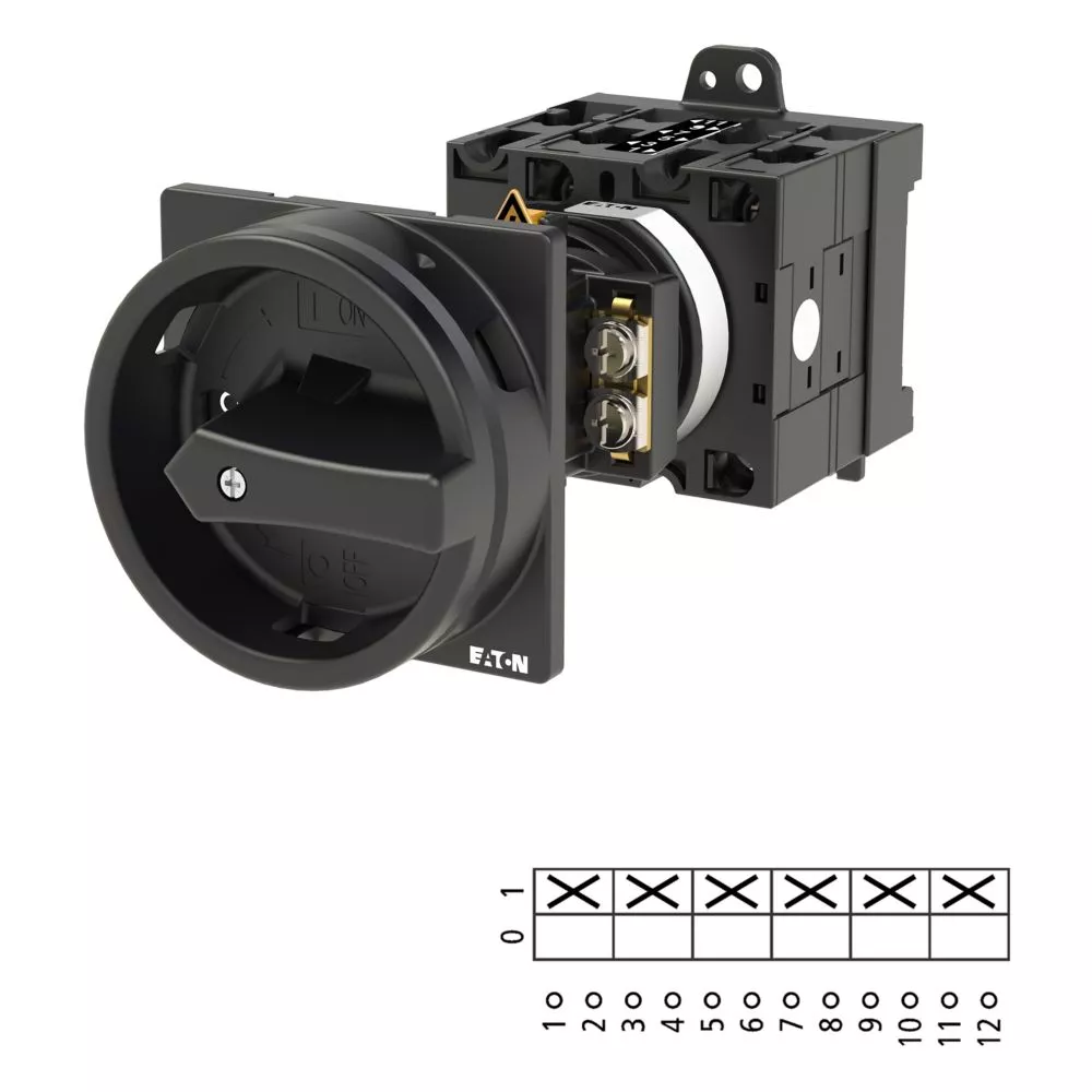 Wyłącznik główny wg IEC/EN60947, wielkość konstrukcyjna T3, konstrukcja pośrednia, klasa ochrony na przedzie IP65 z czarną rękojeścią i wieńcem blokującym zamykanie w położeniu zerowym, pomiarowy prąd stały Iu 32A, znamionowe napięcie pracy Ue 690V, dostępne akcesoria zgodnie z danymi katalogu łączników krzywkowych T