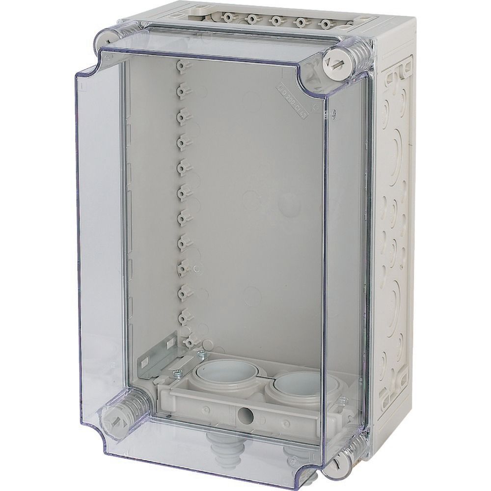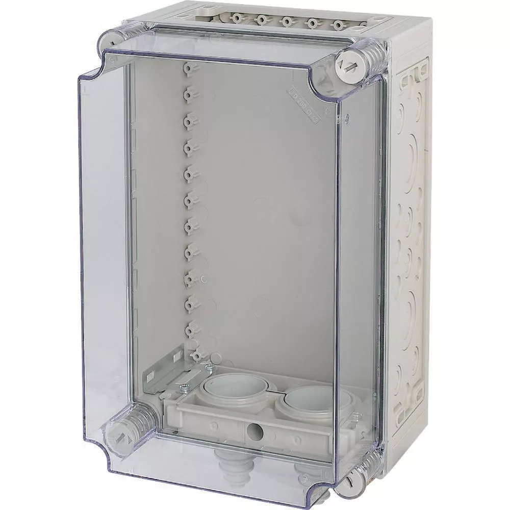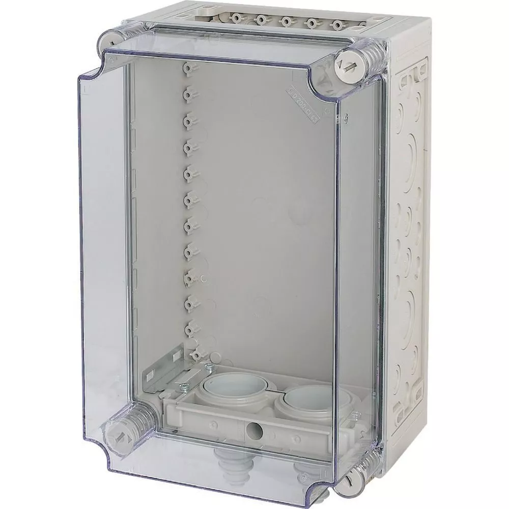 Pusta obudowa rozdzielacza z zamontowanymi wspornikami kablowymi, charakterystyka materiału Poliwęglan (PC), odporność na porażenia, stopień ochrony IP65, opatentowane zamknięcie pokrywy z wbudowanym wyrównaniem nadciśnienia, ściany boczne zamknięte, wybijana, ściany otwarte na górze lub na dole, przewody wkładane od przodu przez dzielone zaciski kablowe, plombowane zamknięcia pokrywy, RAL 7032, piaskowa (skrzynia dolna), przezroczysta, bezbarwna (pokrywa), głębokość montażu przy płyci montażowej=200mm, wersja pokrywy: przezroczysta, wersja części dolnej: na górze otwarta na dole króciec kablowy