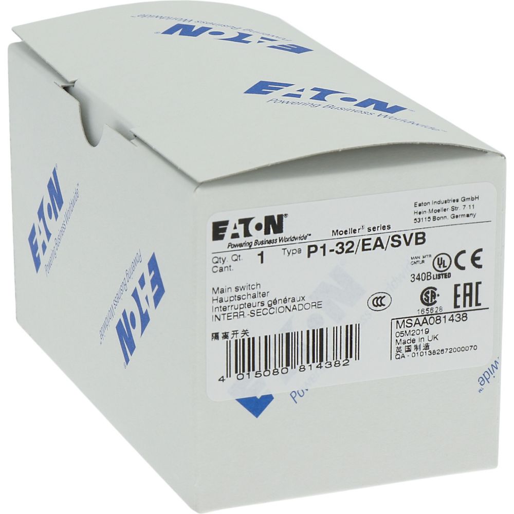 Rozłącznik główny / rozłącznik izolacyjny wł./wył. wg IEC/EN 60947-3, 690V/32A, klasa ochrony przód IP65, rękojeść czerwona z wieńcem blokującym żółtym, zamykanie 3 kłódkami, rozłączniki izolacyjne P1 mają niewielkie wymiary i solidną konstrukcję. Napęd ręczny działa bezpośrednio na zestyki. Zestyki po wyłączeniu rozwierają się w sposób wymuszony.. Ogólne konstrukcje: obudowa natynkowa z izolacją, montaż, montaż centralny, montaż pośredni, montaż rozdzielacza IVS