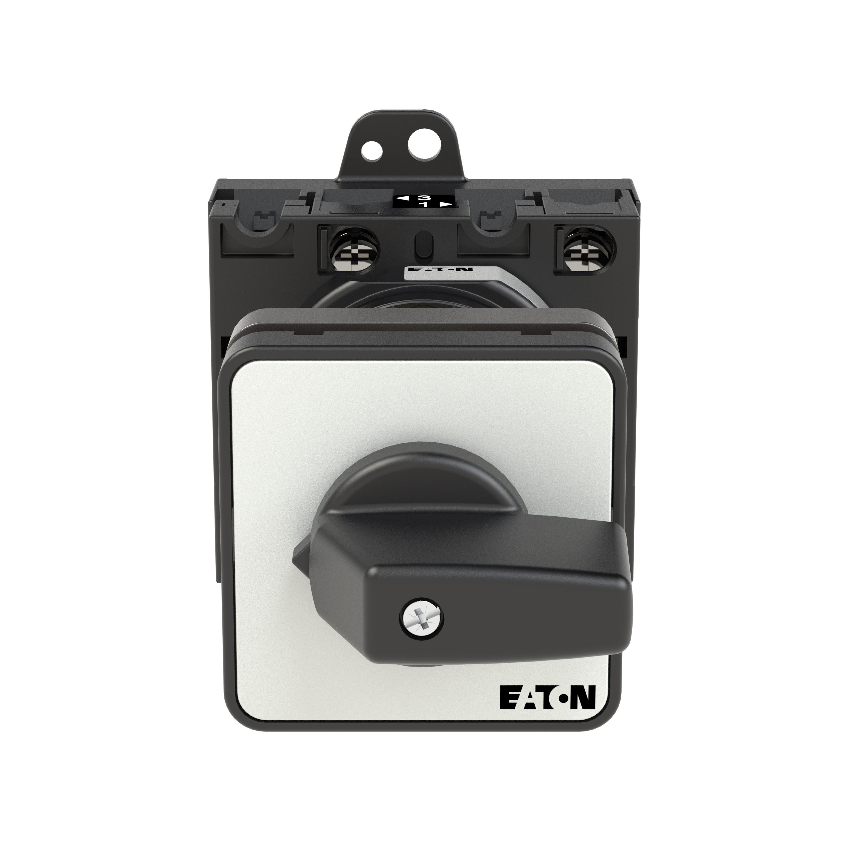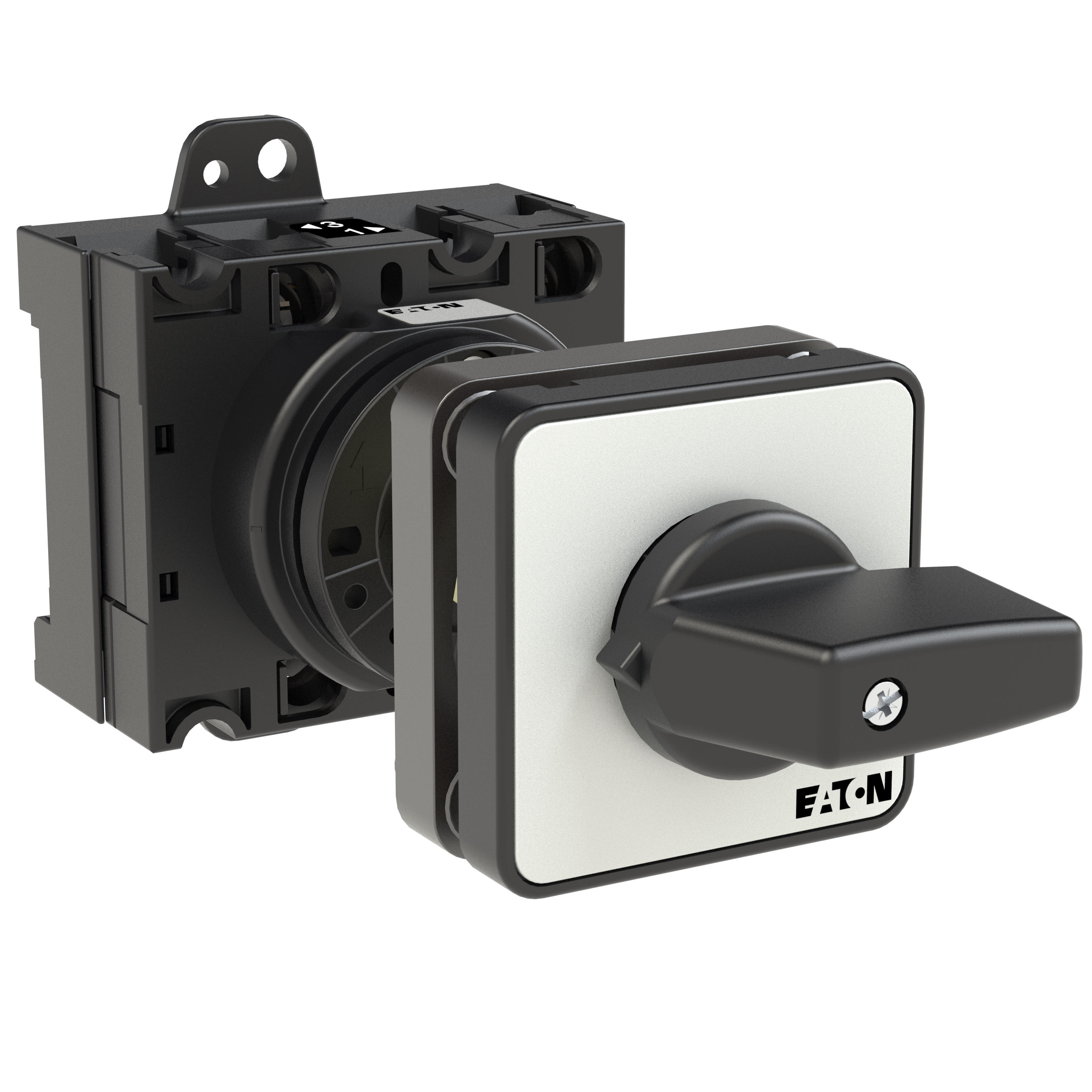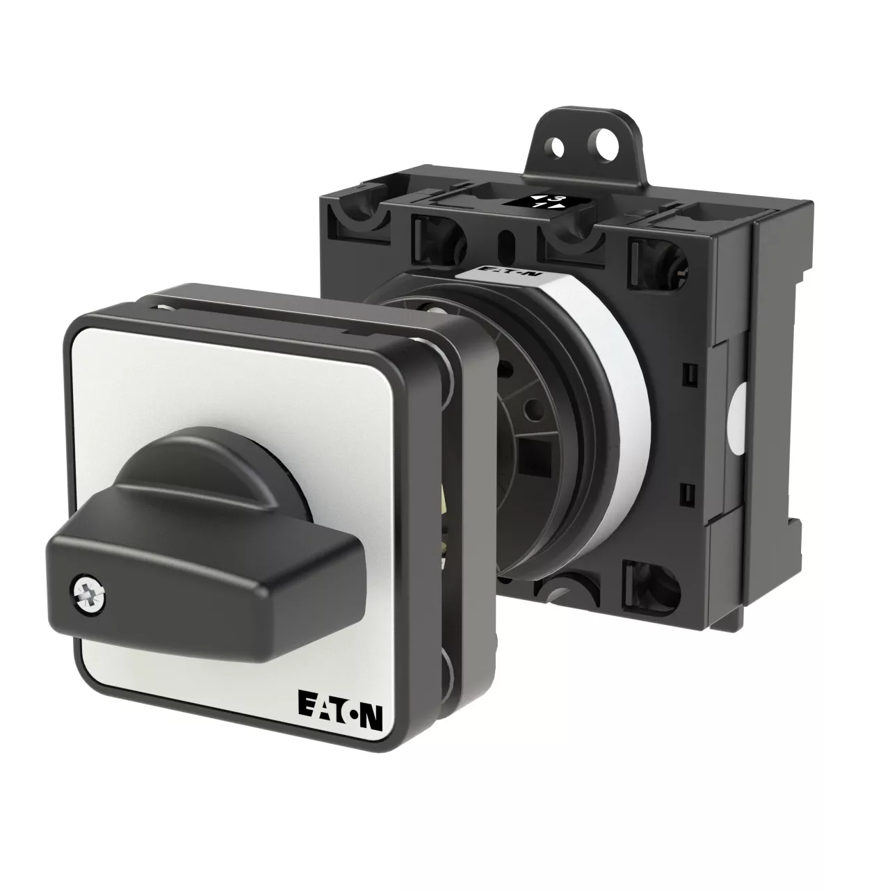 Łącznik krzywkowy wg IEC/EN60947, wielkość konstrukcyjna T3, konstrukcja pośrednia, mocowanie przykręcane zatrzaskowe, napęd sprzęgowy drzwi i pokrywy, tabliczka czołowa 48X48, klasa ochrony na przedzie IP65 z czarnym pokrętłem, pomiarowy prąd stały Iu 32A, znamionowe napięcie pracy Ue 690V, dostępne akcesoria zgodnie z danymi katalogu łączników krzywkowych T
