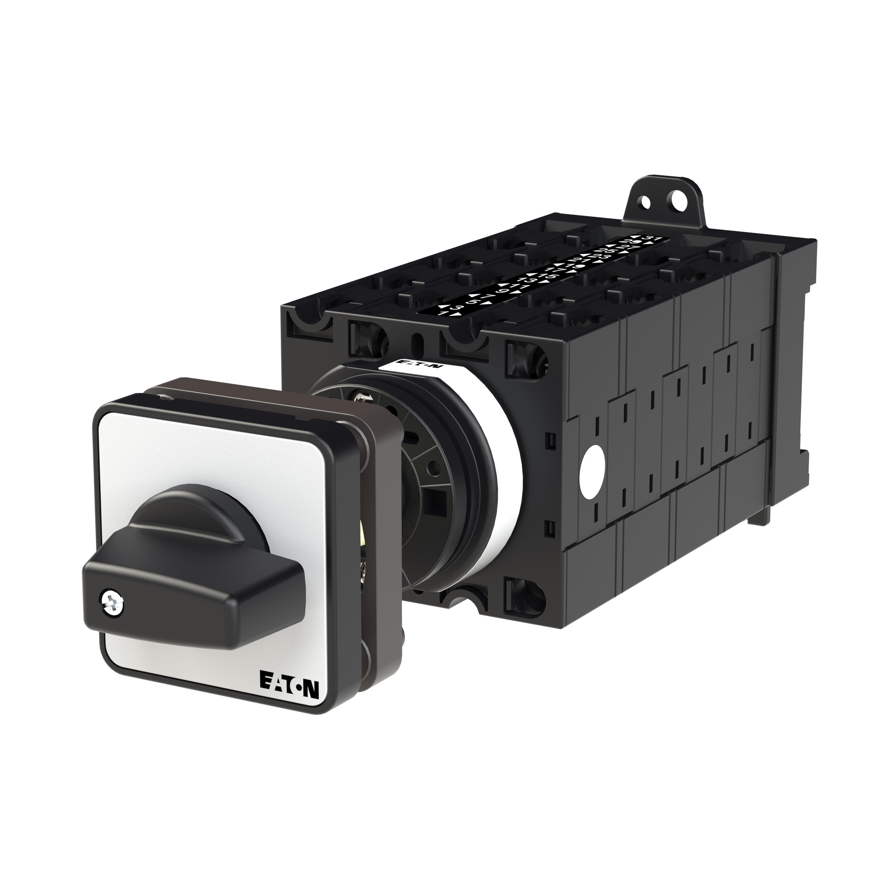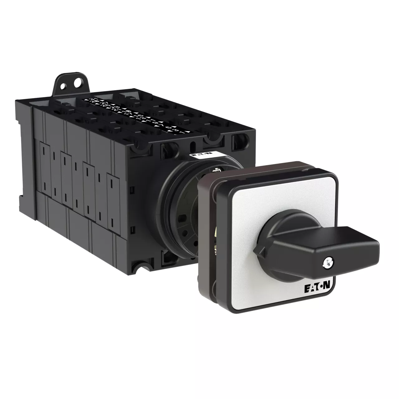 Łącznik krzywkowy wg IEC/EN60947, wielkość konstrukcyjna T3, konstrukcja pośrednia, mocowanie przykręcane zatrzaskowe, napęd sprzęgowy drzwi i pokrywy, tabliczka czołowa 48X48, klasa ochrony na przedzie IP65 z czarnym pokrętłem, pomiarowy prąd stały Iu 32A, znamionowe napięcie pracy Ue 690V, dostępne akcesoria zgodnie z danymi katalogu łączników krzywkowych T