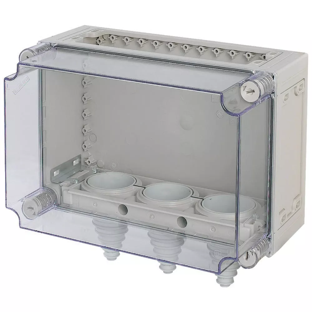 Pusta obudowa rozdzielacza z zamontowanymi wspornikami kablowymi, charakterystyka materiału Poliwęglan (PC), odporność na porażenia, stopień ochrony IP65, opatentowane zamknięcie pokrywy z wbudowanym wyrównaniem nadciśnienia, ściany boczne zamknięte, wybijana, ściany otwarte na górze lub na dole, przewody wkładane od przodu przez dzielone zaciski kablowe, plombowane zamknięcia pokrywy, RAL 7032, piaskowa (skrzynia dolna), przezroczysta, bezbarwna (pokrywa), głębokość montażu przy płyci montażowej=200mm, wersja pokrywy: przezroczysta, wersja części dolnej: na górze otwarta na dole króciec kablowy