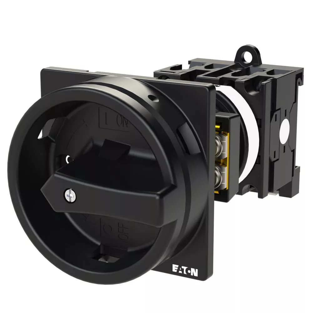 Wyłącznik główny wg IEC/EN60947, wielkość konstrukcyjna T0, konstrukcja pośrednia, klasa ochrony na przedzie IP65 z czarną rękojeścią i wieńcem blokującym zamykanie w położeniu zerowym, pomiarowy prąd stały Iu 20A, znamionowe napięcie pracy Ue 690V, dostępne akcesoria zgodnie z danymi katalogu łączników krzywkowych T. Konstrukcja ogólna: obudowa natynkowa z izolacją, montaż, montaż centralny, montaż pośredni montaż rozdzielacza IVS.