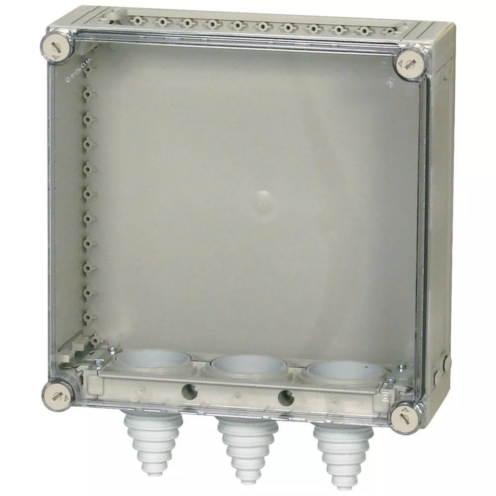 Pusta obudowa rozdzielacza z zamontowanymi wspornikami kablowymi, charakterystyka materiału Poliwęglan (PC), odporność na porażenia, stopień ochrony IP65, opatentowane zamknięcie pokrywy z wbudowanym wyrównaniem nadciśnienia, ściany boczne zamknięte, wybijana, ściany otwarte na górze lub na dole, przewody wkładane od przodu przez dzielone zaciski kablowe, plombowane zamknięcia pokrywy, RAL 7032, piaskowa (skrzynia dolna), przezroczysta, bezbarwna (pokrywa), głębokość montażu przy płyci montażowej=125mm, wersja pokrywy: przezroczysta, wersja części dolnej: na górze otwarta na dole króciec kablowy