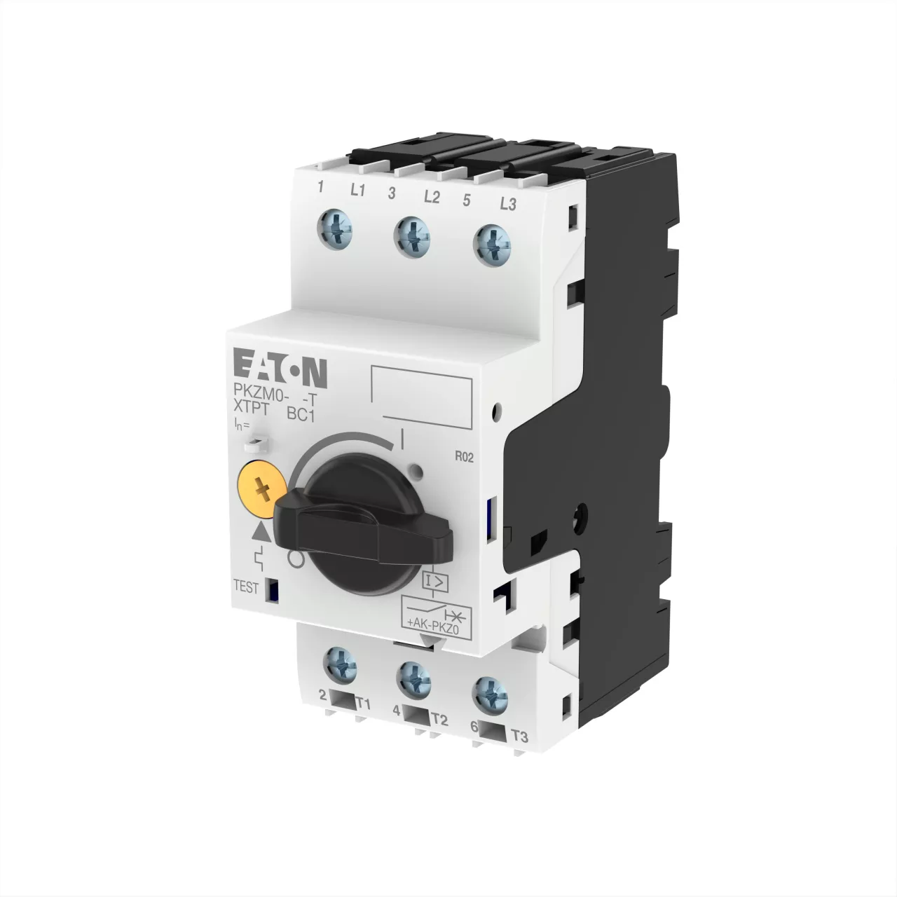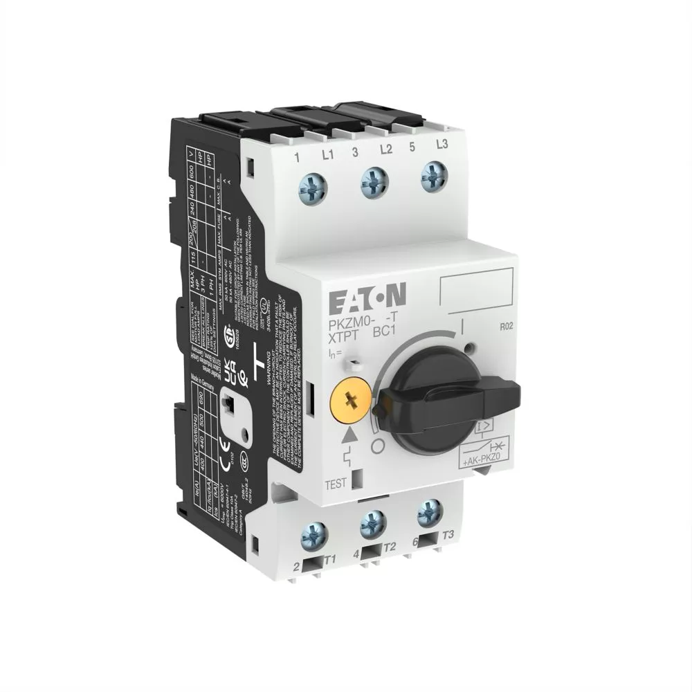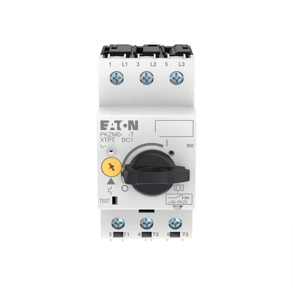 Wyłącznik ochronny transformatora z normą IEC/EN60947, 3-biegunowe wielkość konstrukcyjna PKZM 0, z regulowanym wyzwalaczem przeciążeniowym i zwarciowym bez opóźnienia, czuły na brak fazy, mocowanie na śruby i zaciski, Z zaciskami ze śrubą, wymiary montażowe zatyczki 45mm, znamionowe napięcie pracy Ue 690V, stopień ochrony IP20, zabezpieczenie przed dotknięciem zgodnie z VDE 0106 cz. 100, dostępne akcesoria: łącznik pomocniczy, wyzwalacz napięcia