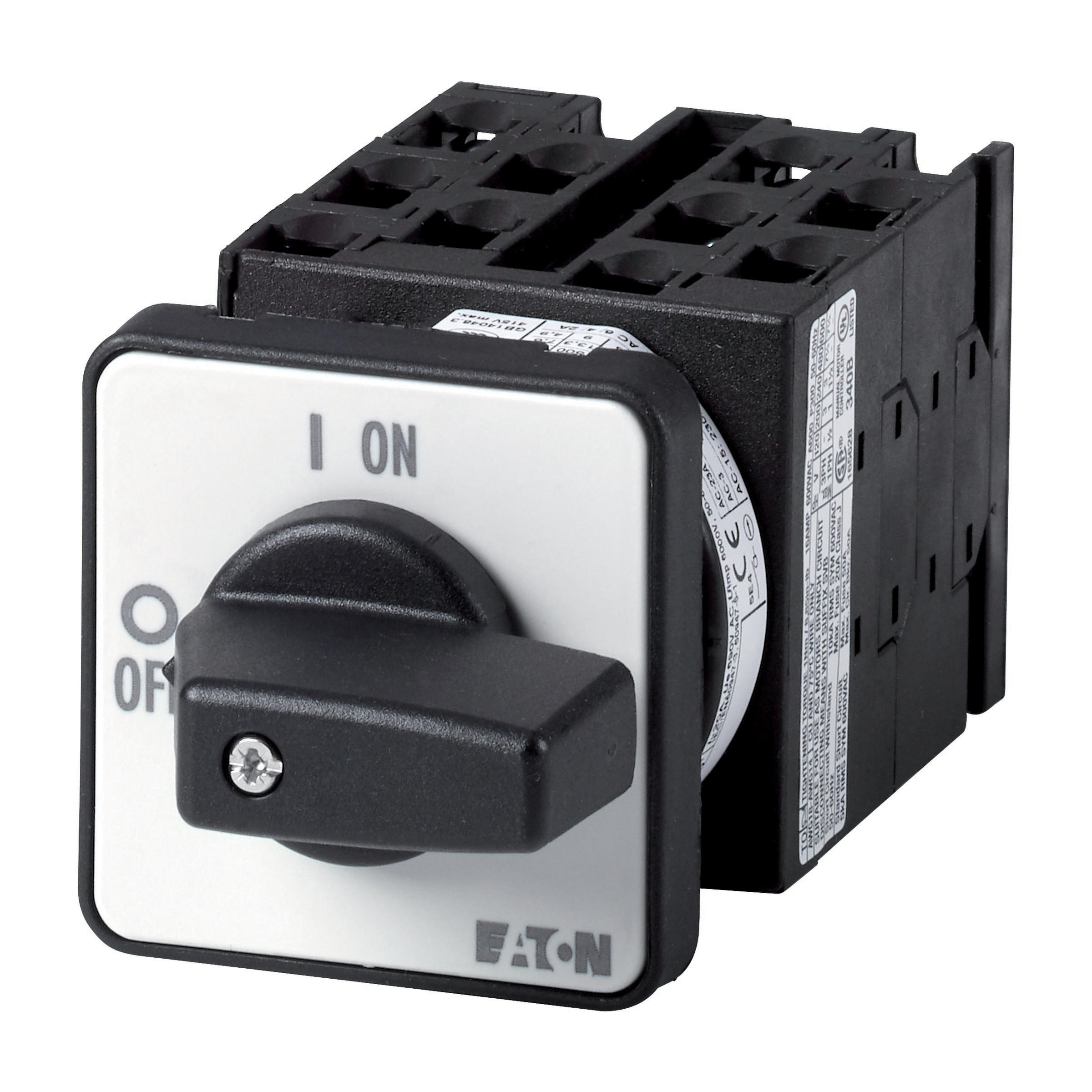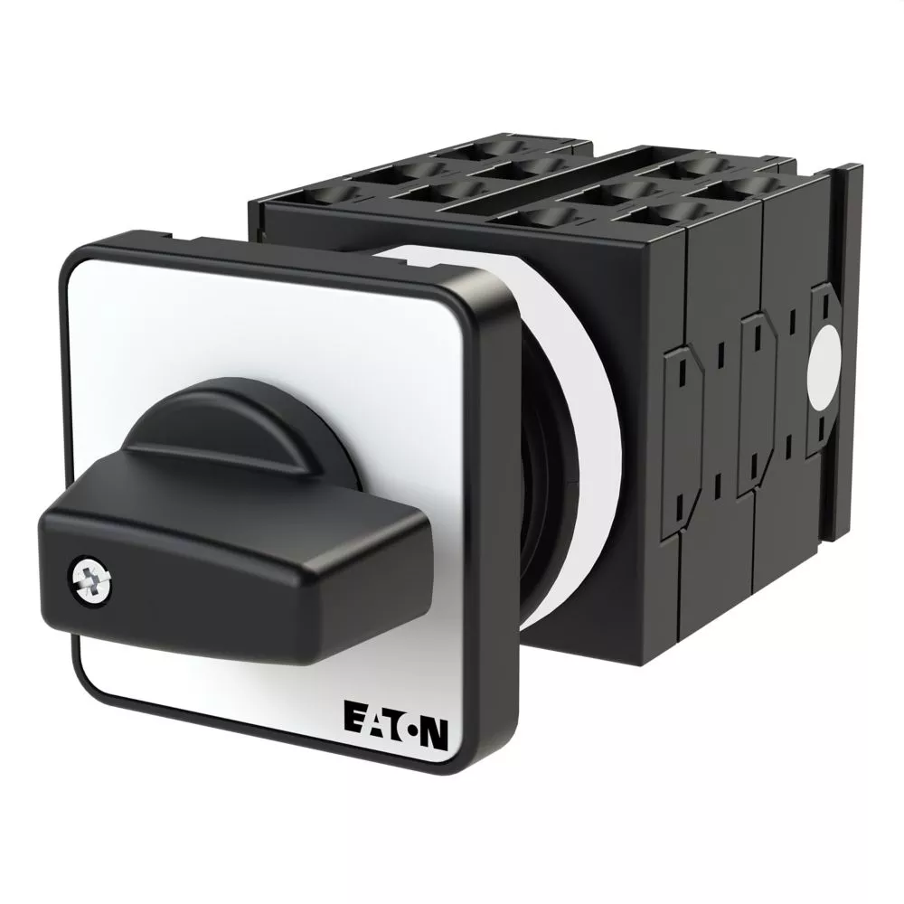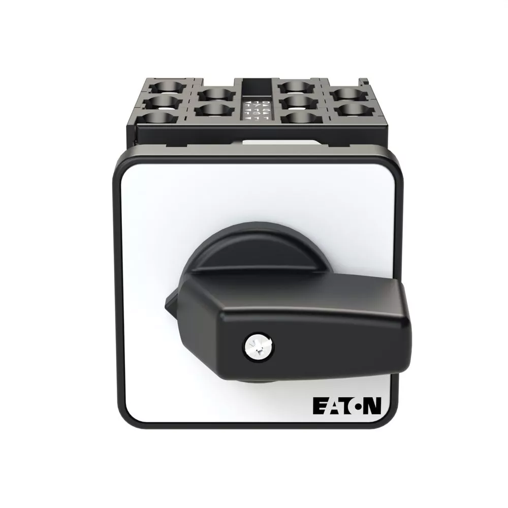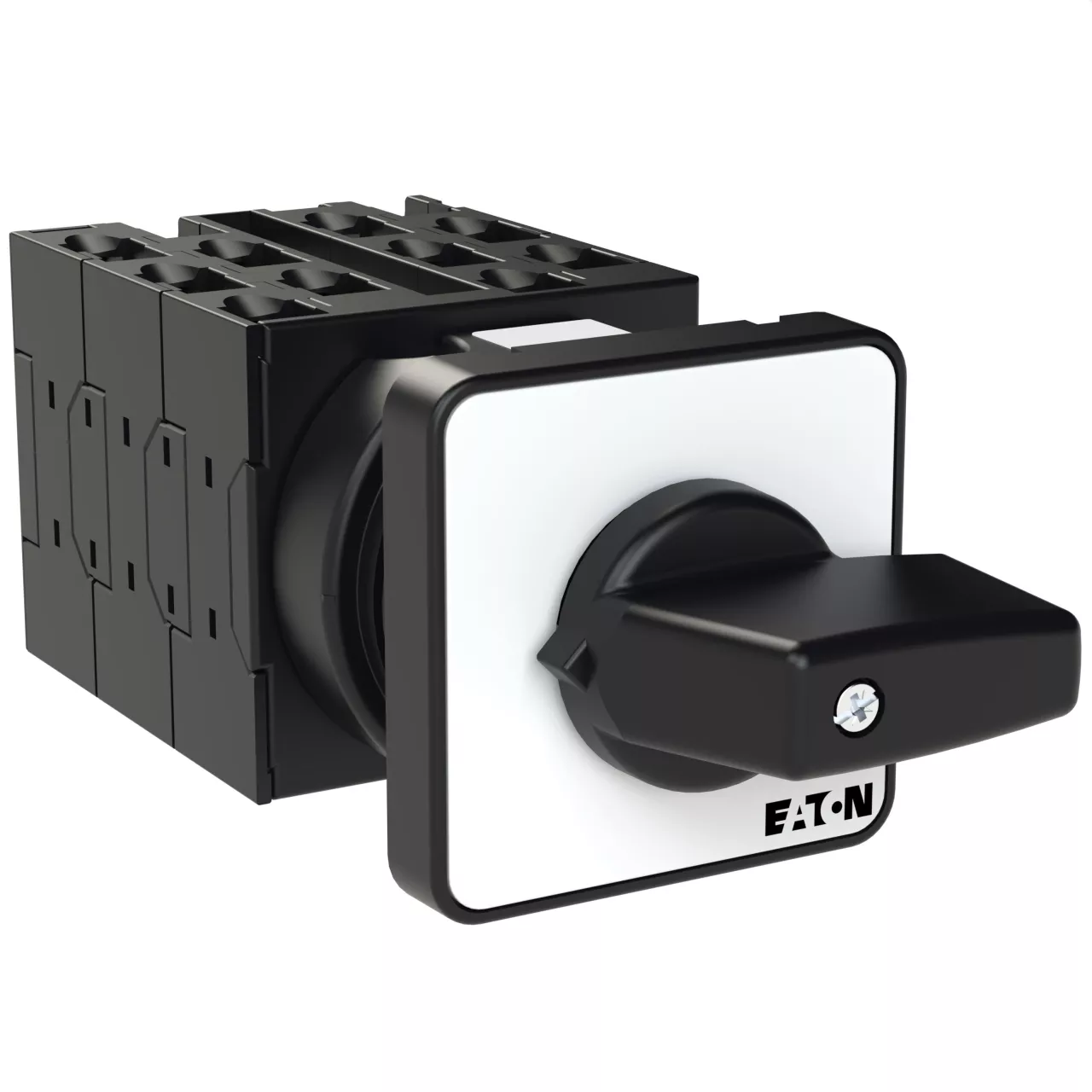 Łącznik krzywkowy wg IEC/EN60947, wielkość konstrukcyjna T0, kształt montażu, tabliczka czołowa 48X48, klasa ochrony na przedzie IP65 z czarnym pokrętłem, pomiarowy prąd stały Iu 20A, znamionowe napięcie pracy Ue 690V, dostępne akcesoria zgodnie z danymi katalogu łączników krzywkowych T. Konstrukcja ogólna: obudowa natynkowa z izolacją, montaż, montaż centralny, montaż pośredni montaż rozdzielacza IVS.