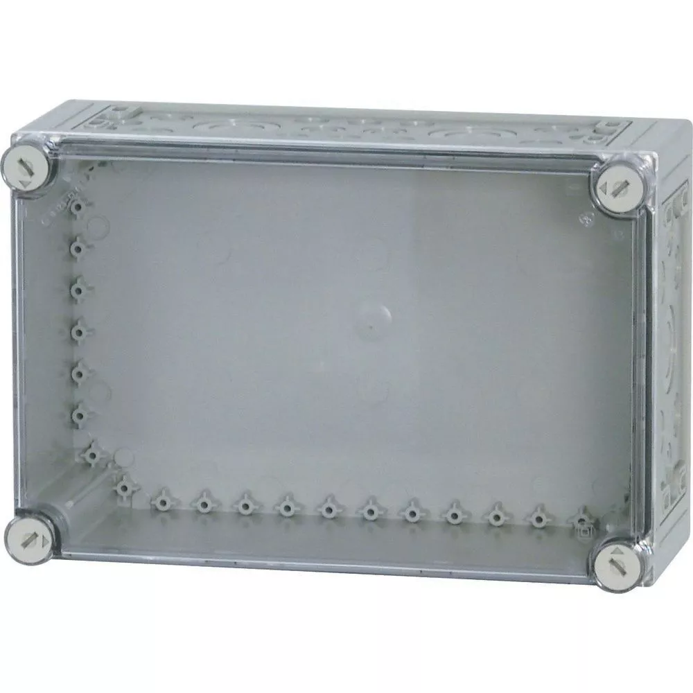 Pojedyncza obudowa bez wyposażenia, charakterystyka materiału Poliwęglan (PC), odporność na porażenia, stopień ochrony IP65, opatentowane zamknięcie pokrywy z wbudowanym wyrównaniem nadciśnienia, z metrycznymi wytłoczeniami na wszystkich ścianach bocznych, wprowadzenie przewodów na górze i na dole=2xM50/32 i 6xM25/16 i 8xM20, po boku po=1xM50/32 i 6xM25/16, łączniki mocujące do uchwytu ściennego, plombowane zamknięcia pokrywy, ściany boczne odchylane, po wybiciu ścian bocznych możliwość przerobienia na obudowę, RAL 7032, piaskowa (skrzynia dolna), przezroczysta, bezbarwna (pokrywa), głębokość montażu przy płyci montażowej=125mm, wersja pokrywy: przezroczysta, wersja części dolnej: wytłaczana, pokrywa z opcjonalnym doposażeniem w zamek bębenkowy DVZ...-CI
