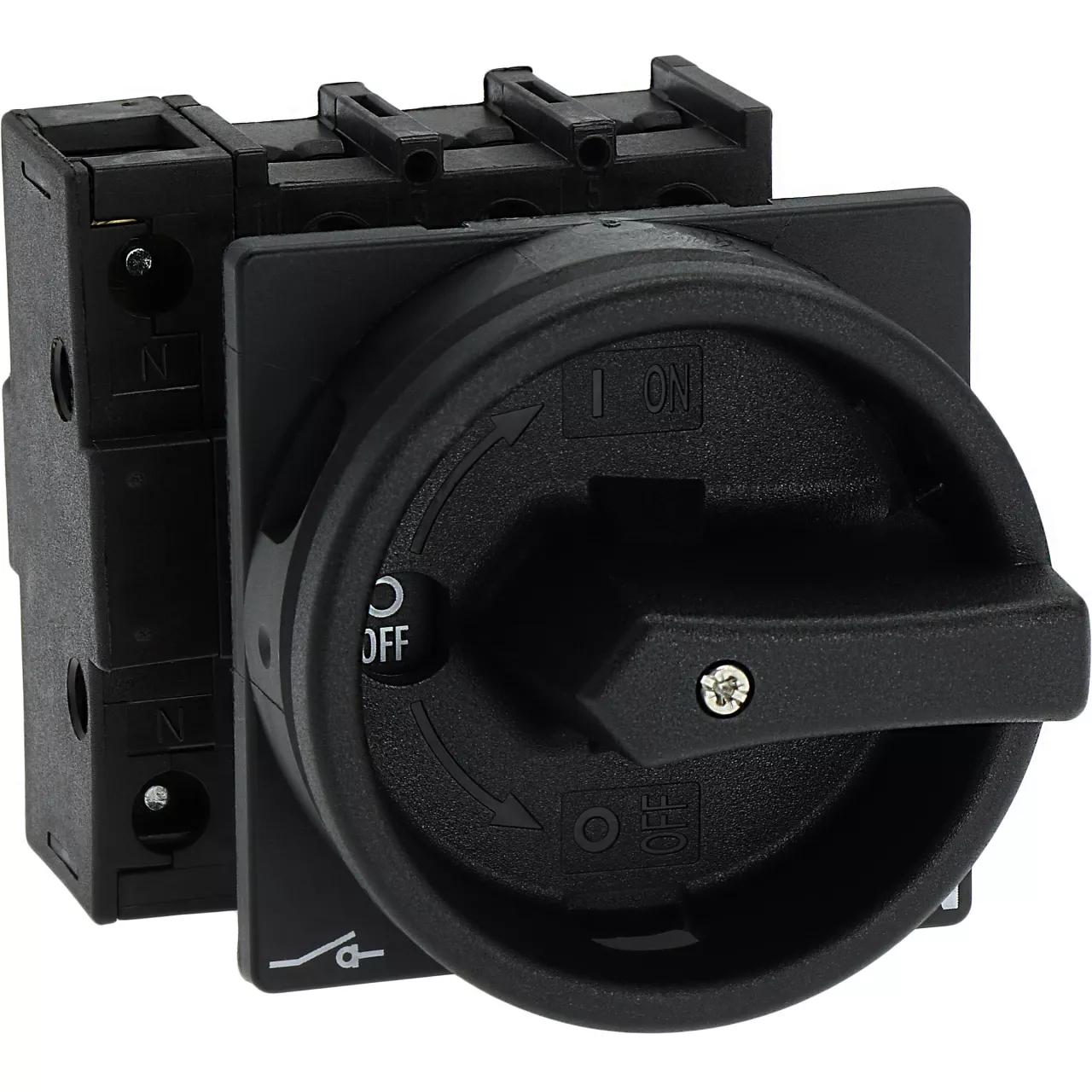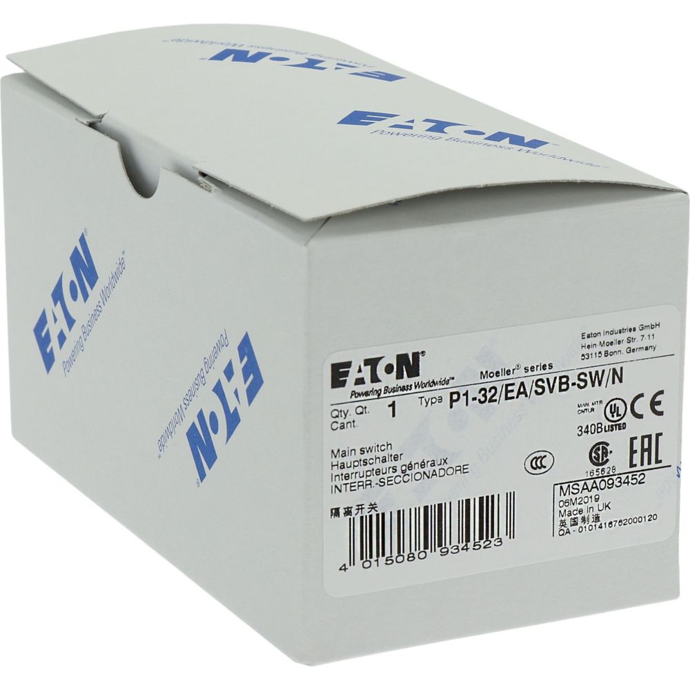 P1-32/EA/SVB-SW/N Rozłącznik główny, 3 bieg. + N, 32 A, funkcja awaryjnego zatrzymania , blok. na kłódkę w pozycji Wył., montaż natablicowy, pokrętło czarne z blokadą na kłódkę