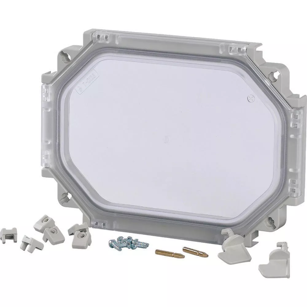 Pojedyncze drzwi, stopień ochrony IP65, ogranicznik drzwi z możliwością zamiany stron po prawej, po lewej, na górze lub na dole, kąt rozwarcia łuku do 180°, przezroczyste, zakres dostawy włącznie z szablonem i elementami mocującymi