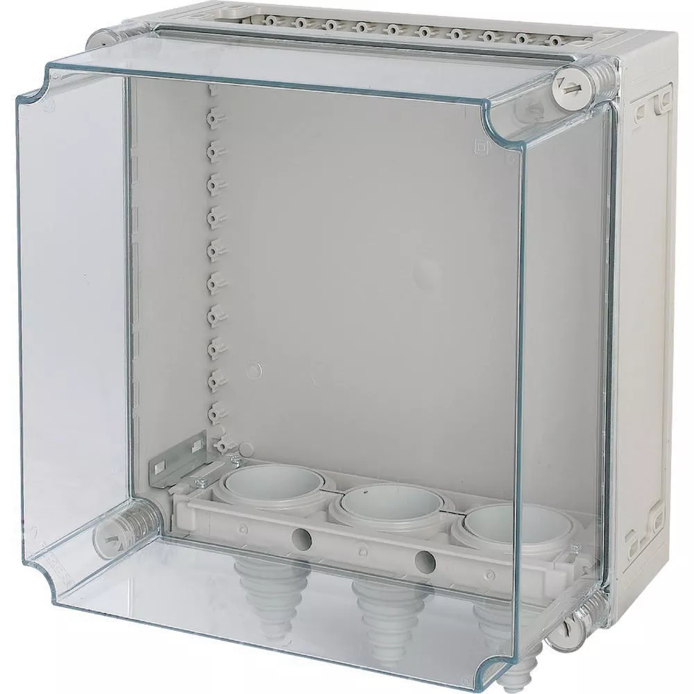 Pusta obudowa rozdzielacza z zamontowanymi wspornikami kablowymi, charakterystyka materiału Poliwęglan (PC), odporność na porażenia, stopień ochrony IP65, opatentowane zamknięcie pokrywy z wbudowanym wyrównaniem nadciśnienia, ściany boczne zamknięte, wybijana, ściany otwarte na górze lub na dole, przewody wkładane od przodu przez dzielone zaciski kablowe, plombowane zamknięcia pokrywy, RAL 7032, piaskowa (skrzynia dolna), przezroczysta, bezbarwna (pokrywa), głębokość montażu przy płyci montażowej=250mm, wersja pokrywy: przezroczysta, wersja części dolnej: na górze otwarta na dole króciec kablowy