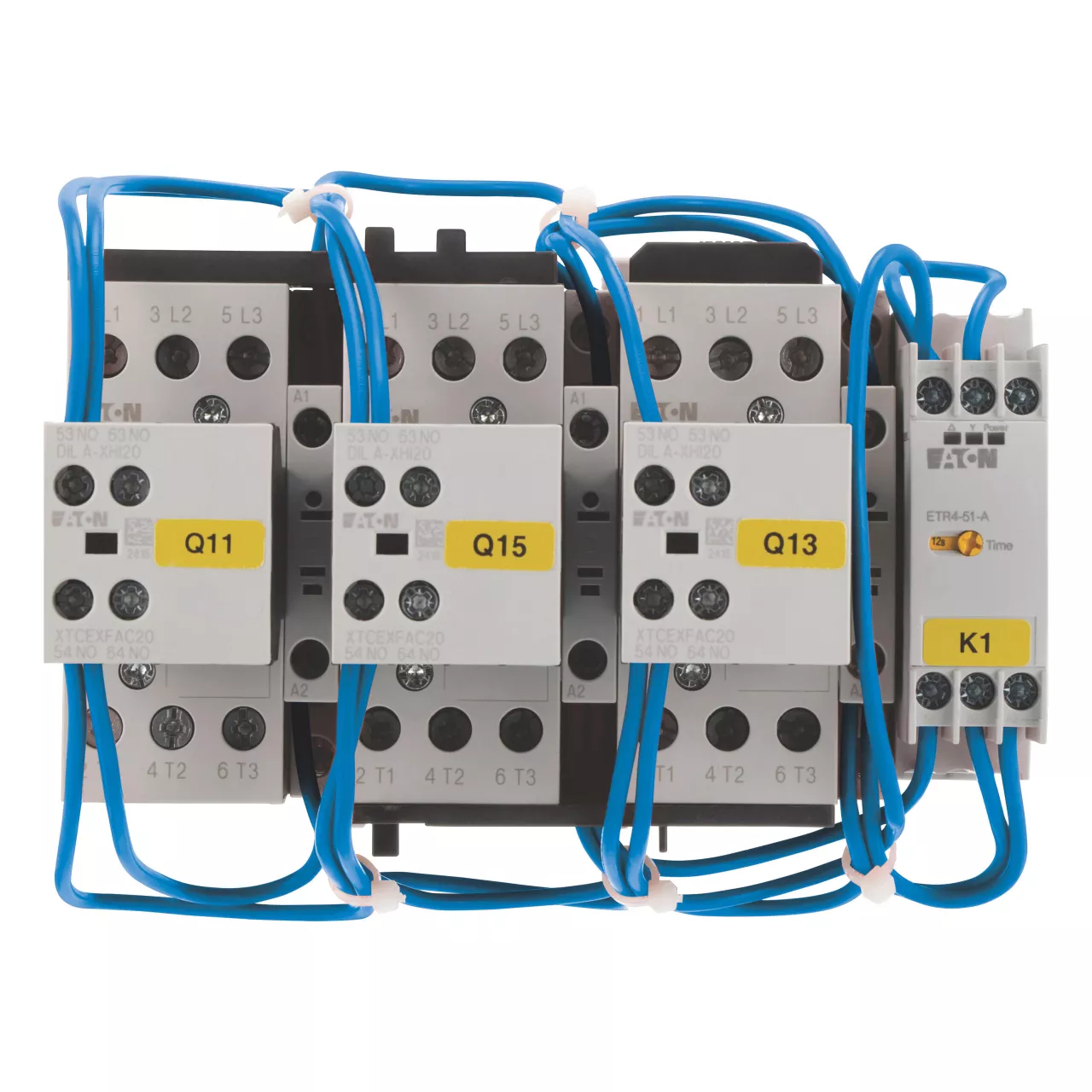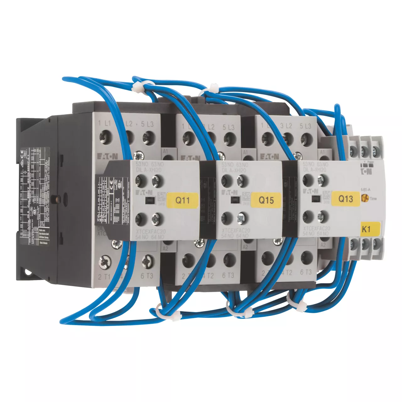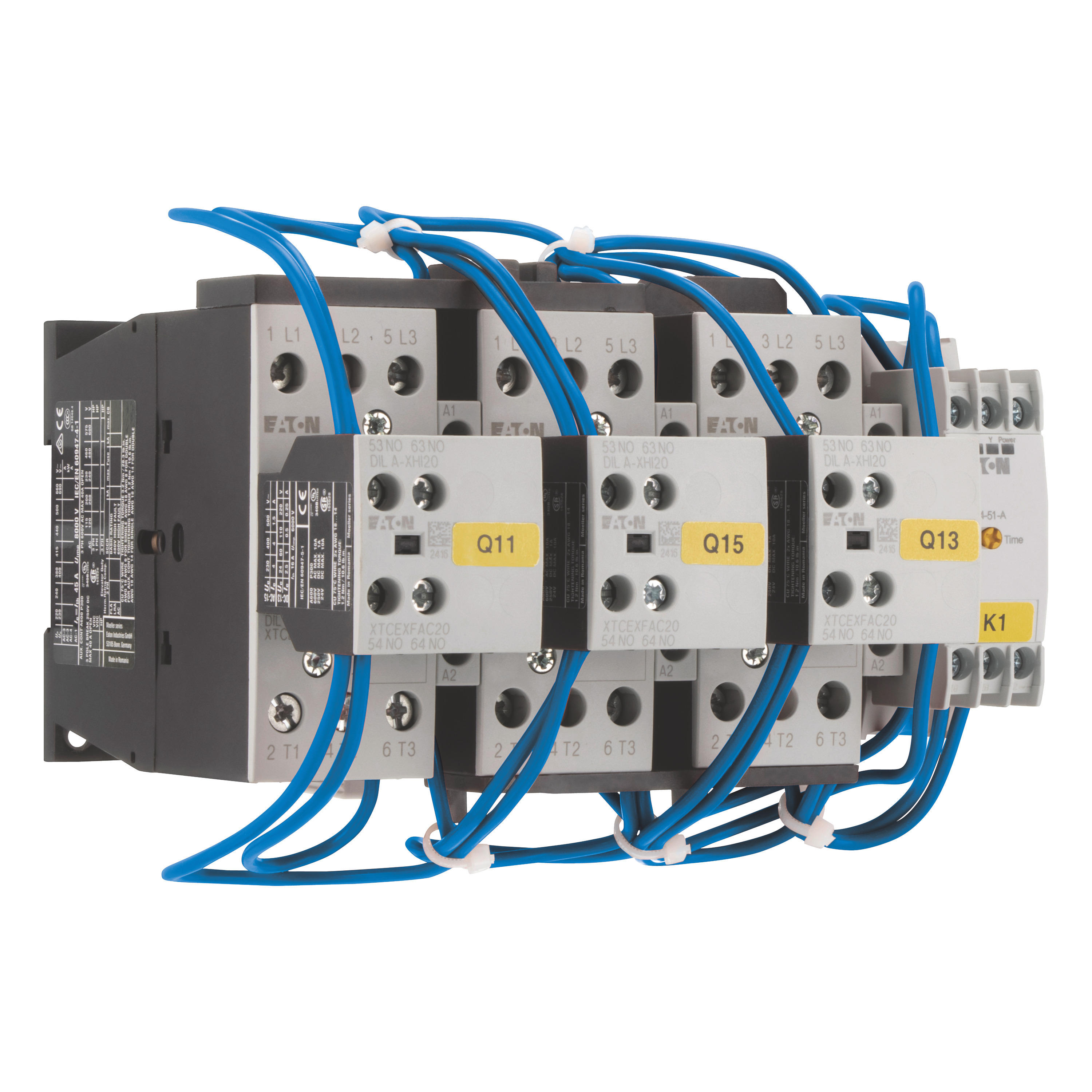 Kombinacja styczników trójkąt-gwiazda, Zastosowanie: Kombinacje styczników do uruchamiania silnika w układzie trójkąt-gwiazda, Częstotliwość pracy: maks. 30 załączeń na godzinę, Akcesoria: Rozruszniki gwiazda-trójkąt SDAINL, Kategoria użytkowa: NAC-3: Standardowe silniki indukcyjne AC: rozruch, wyłączanie w trakcie pracy, Znamionowy prąd roboczy AC-3, 380 V 400 V: Ie = 30 A, Maks. moc znamionowa dla trójfazowych silników, 50 - 60 Hz AC-3 220 V 230 V: P= 7,5 kW, 380 V 400 V: P = 15 kW, 500 V: P= 18,5 kW, 660 V 690 V: P = 18,5 kW, Maks. czas przełączenia: 20 s, Napięcie sterujące: 24 V DC, Napięcie AC/DC: Praca DC, Indywidualne komponenty kombinacji Stycznik sieciowy Q11: DILM17-10