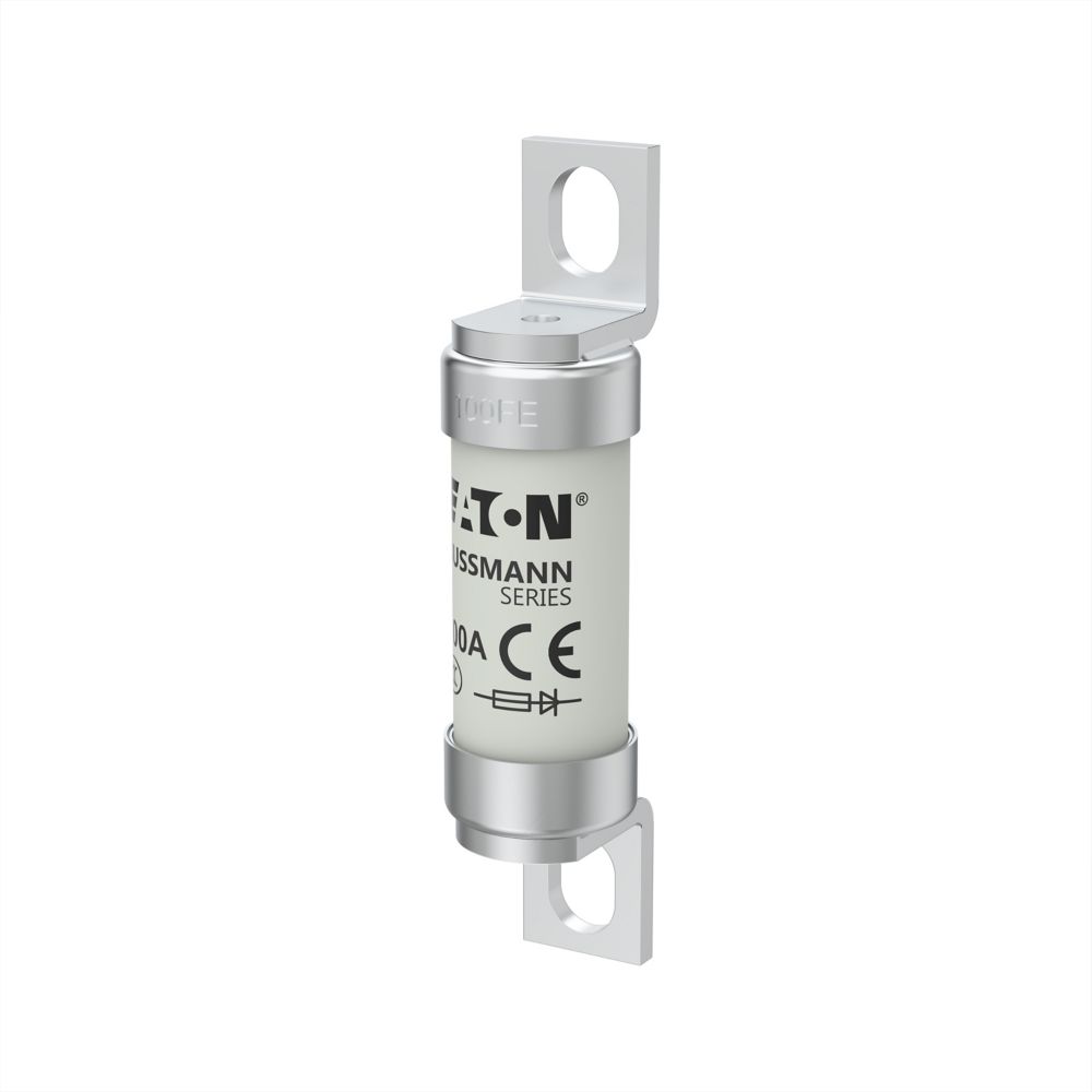 Sicherung, Sicherungseinsatz, superflink, 100 A, 690 V AC, 500 V DC, BS88, 19 x 77 mm, aR, BS, gekröpfte verschraubte Anschlussfahnen, gemeinsamer DC-Bus, Gleichstromantriebe, Leistungsumrichter/Gleichrichter und Anlasser mit reduzierter Spannung, BS88-4, IEC 60269-4, Ausschaltvermögen 200 kA, Optionale Zusatzausrüstung Sicherungshalter BH-0111