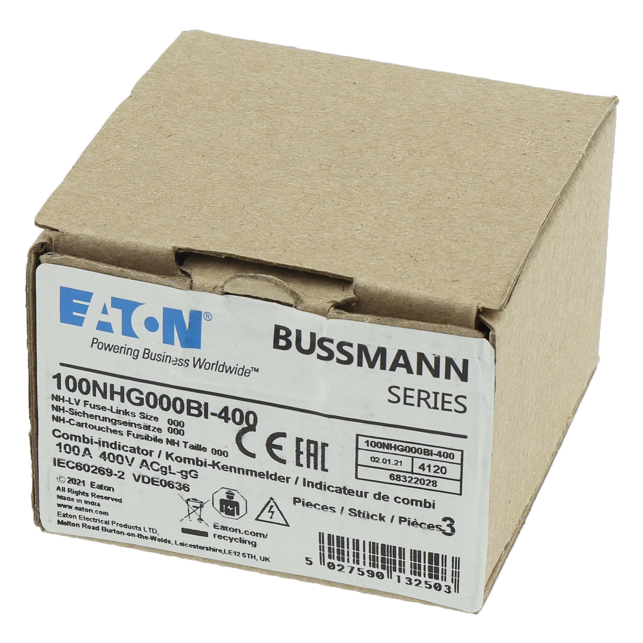 Bezpiecznik, wkładka bezpiecznikowa, niskie napięcie, 100 A, AC 400 V, NH000, gL/gG, IEC, Układ podwójnego sygnalizatora (kombinacja), korpus kwadratowy ze stykami nożowymi, ruchome uchwyty, IEC 60269-2 układ bezpiecznikowy A, DIN 43620, VDE 0636-2. Zdolność wyłączania 120 kA