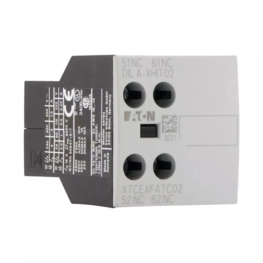Hulpcontactblok, met onderling vergrendelde tegenoverliggende contacten, schakelelementen volgens EN 50005, versie E combinaties komen overeen met EN 50011 en hebben de voorkeur. De DC bekrachtigde relais DILA(C)-22 mag alleen worden gecombineerd met 2-polige hulpcontacten. Functie: voor combinatie met elektrische bedrading, 2-polig, aansluittechniek: schroefklemmen, nominale bedrijfsstroom AC-15 220 V 230 V 240 V: Ie= 4 A, nominale bedrijfsstroom AC-15 380 V 400 V 415 V: Ie= 4 A, contacten nc = normaal gesloten: 2 nc, type montage: Frontbevestiging, voor gebruik met: DILM7…, DILM9…, DILM12…, DILM15…, DILL…, MSC-D…M7(9, 12, 15)…, MSC-R…M7(9, 12)