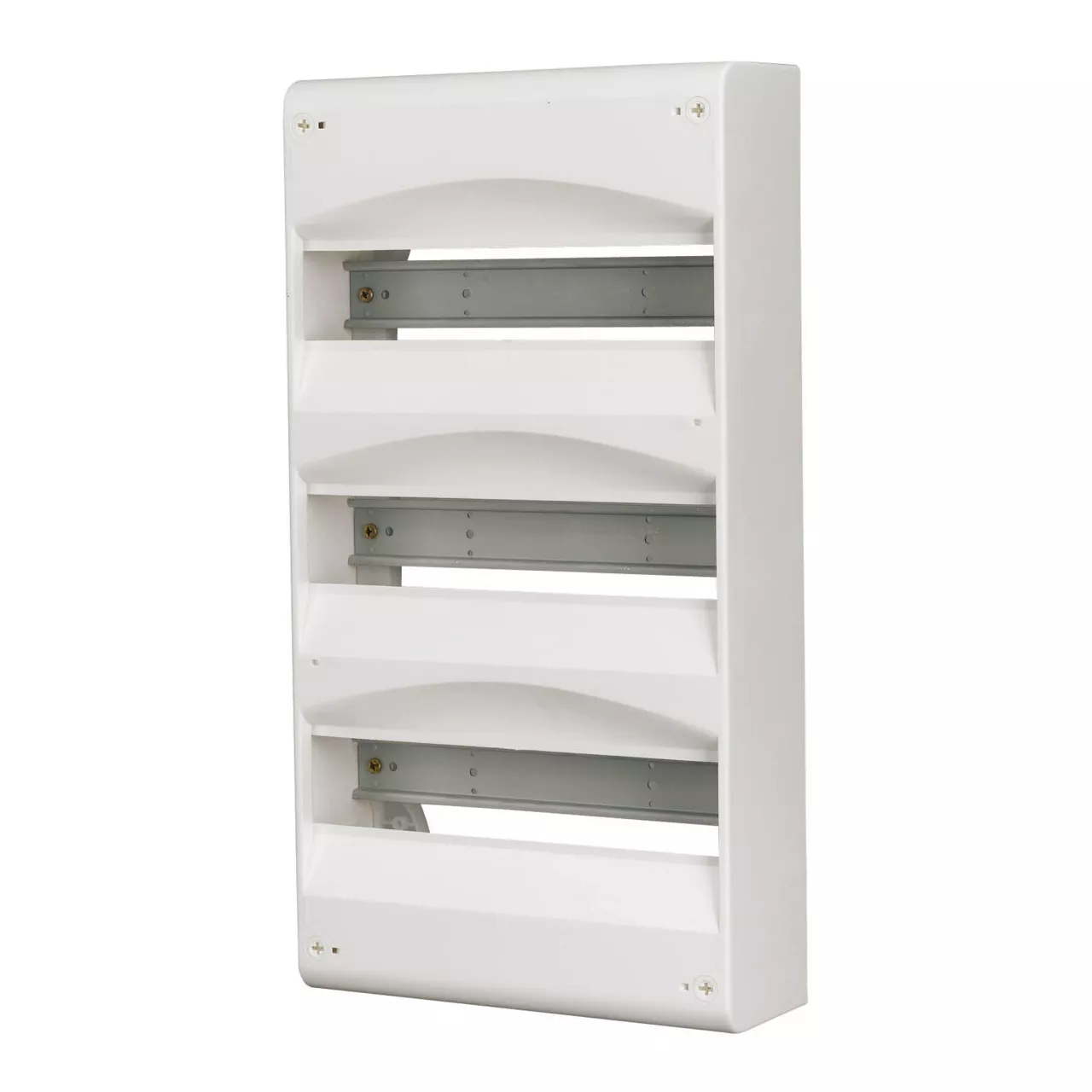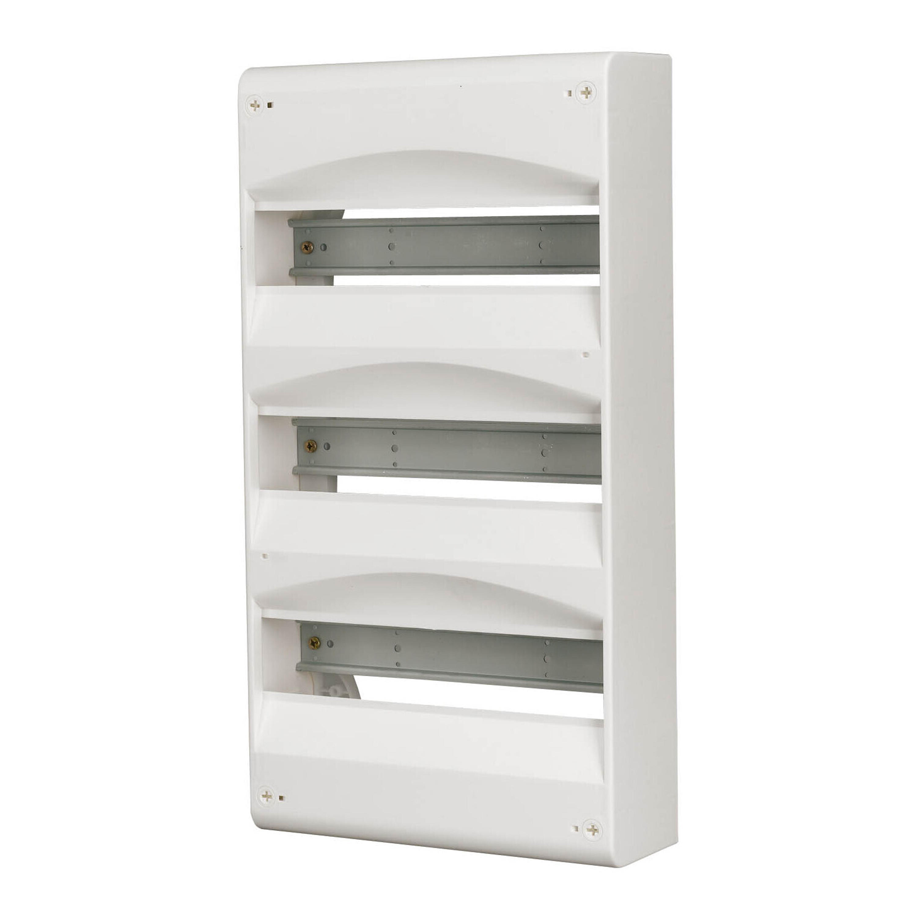 Installationsverteiler zur Aufputzmontage, 3-reihig, 39 MU, Schutzklasse 1, Lieferumfang: Kunststoffgehäuse, DIN-Hutschiene, Null- und Schutzleiterklemme mit Klemmenträger, Montagehinweise, Beschriftungsbogen