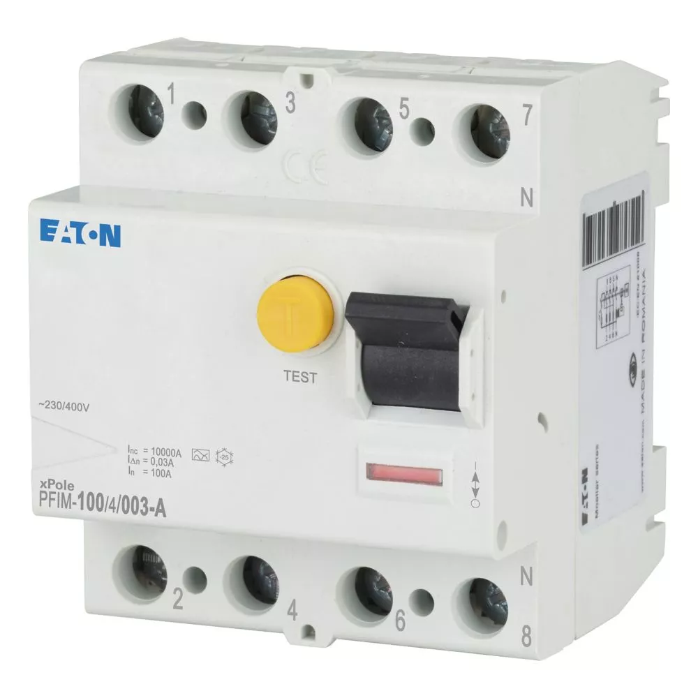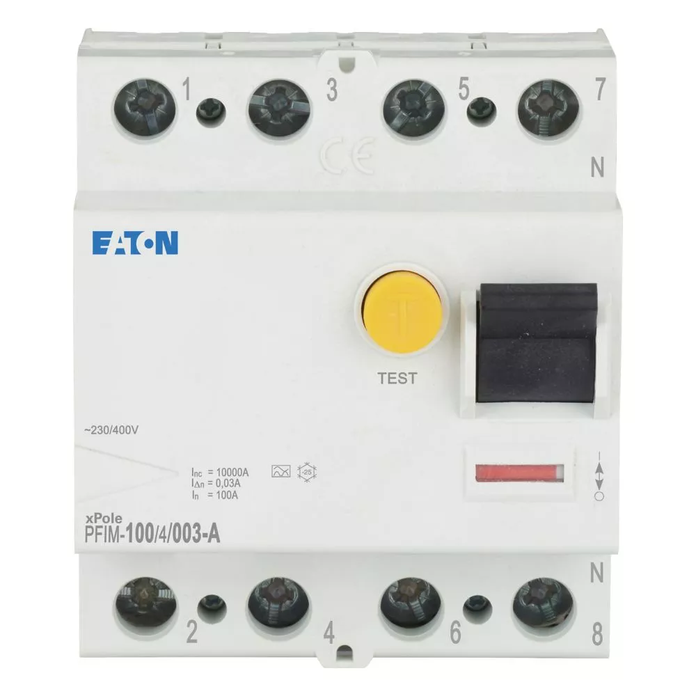 Fehlerstrom-Schutzschalter PFIM, 4-polig, Bemessungsstrom Ein: 100 A, Bemessungskurzschlussfestigkeit Icn: 10 kA, Bemessungsfehlerstrom IΔN: 0,03 A, Schaltgeräte für den Wohnungsbereich und kommerzielle Anwendungen