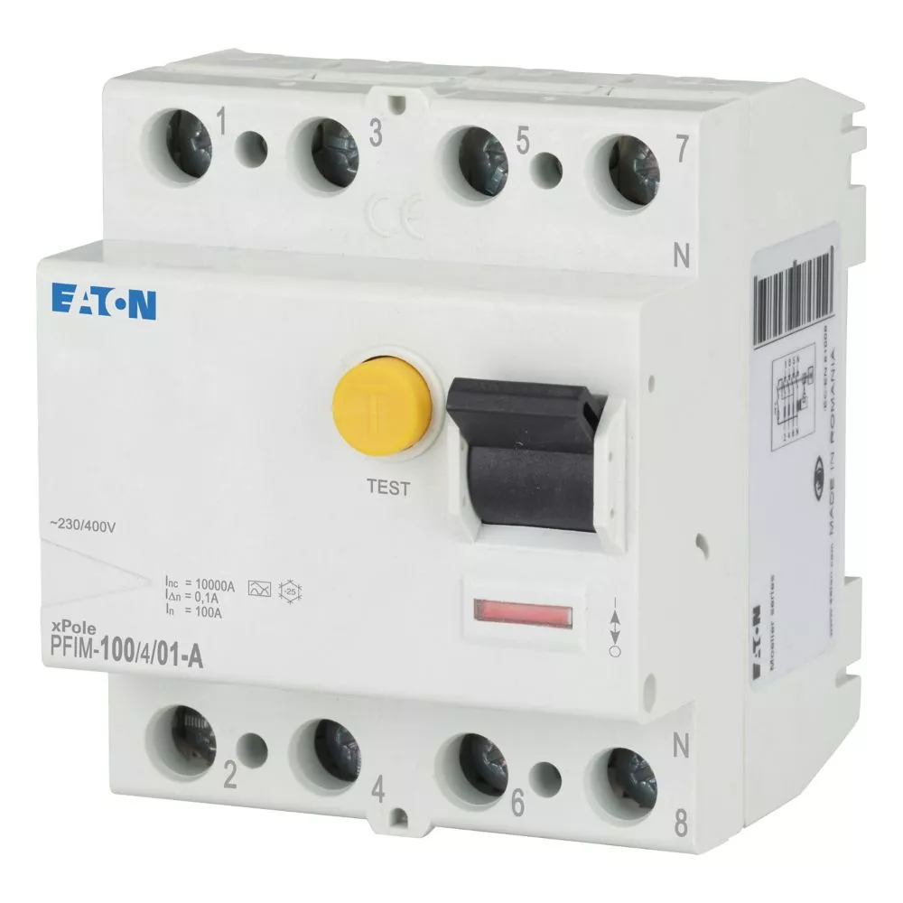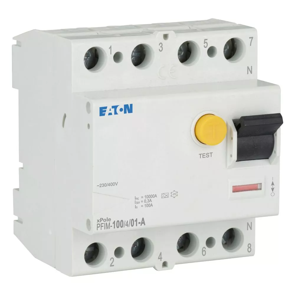 Fehlerstrom-Schutzschalter PFIM, 4-polig, Bemessungsstrom Ein: 100 A, Bemessungskurzschlussfestigkeit Icn: 10 kA, Bemessungsfehlerstrom IΔN: 0,1 A, Schaltgeräte für den Wohnungsbereich und kommerzielle Anwendungen