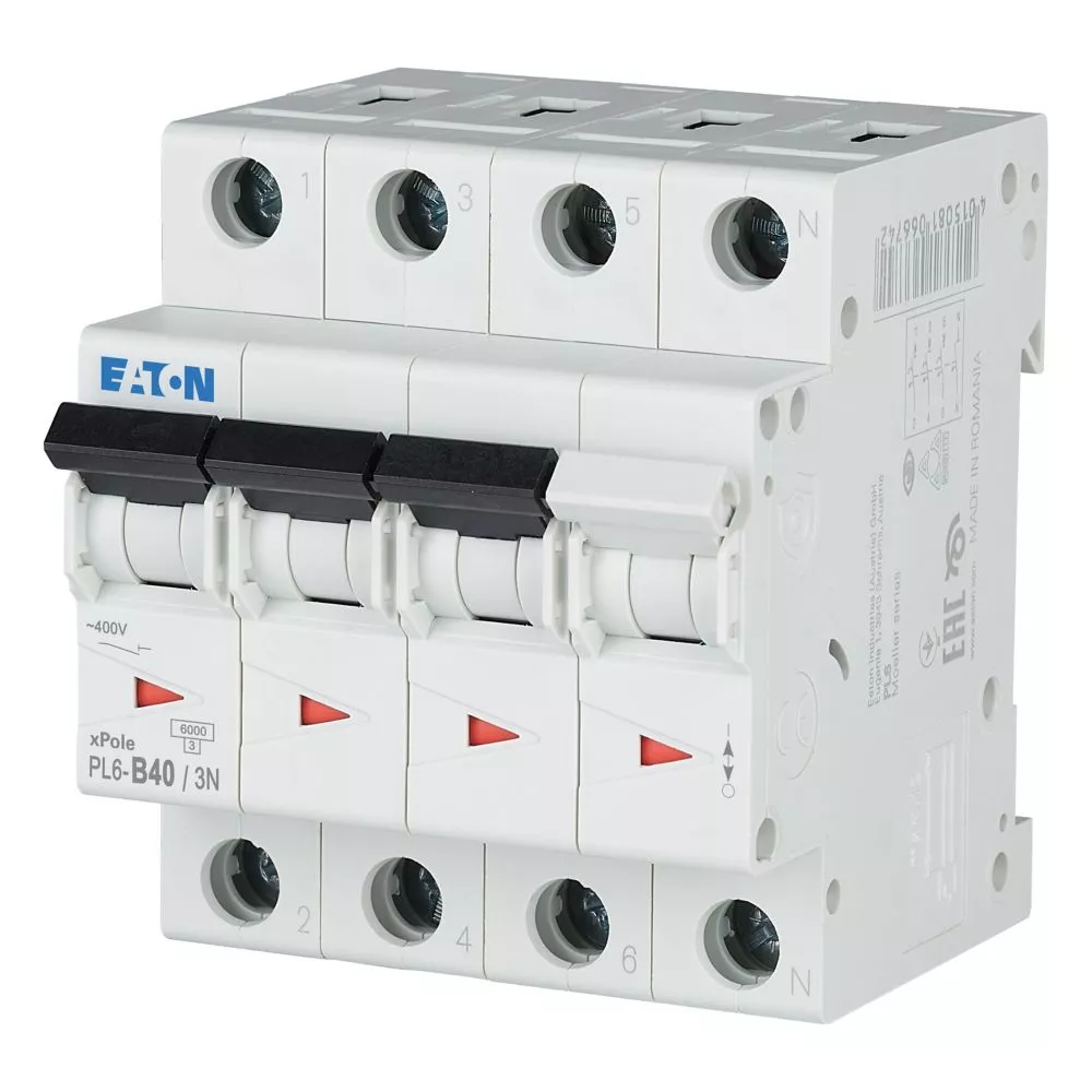 Leitungsschutzschalter (MCB), PL6, 3-polig + N, Auslösecharakteristik: B, Bemessungsstrom Ein: 40 A, Bemessungsschaltvermögen nach IEC/EN 60898-1: 6 kA, Schaltgeräte für den Wohnungsbereich und kommerzielle Anwendungen