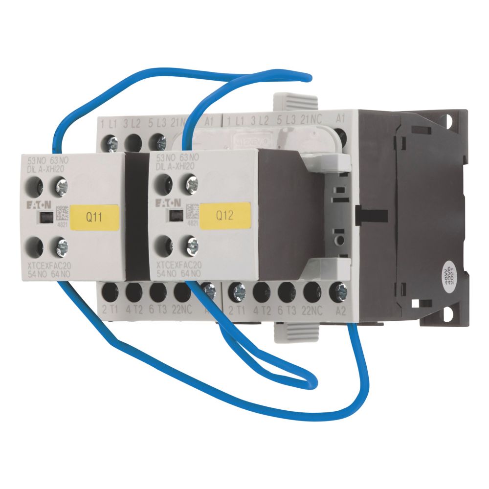 Kombinacja styczników nawrotnych, Zastosowanie: Kombinacje styczników do silników rozruchowych z dwoma kierunkami obrotów, Akcesoria: Rozruszniki nawrotne DIUL, Kategoria użytkowa: NAC-3: Standardowe silniki indukcyjne AC: rozruch, wyłączanie w trakcie pracy, AC-4: Standardowe silniki indukcyjne AC: rozruch, wtykanie, odwracanie, praca spowolniona, Znamionowy prąd roboczy AC-3, 380 V 400 V: Ie= 7 A, Maks. moc znamionowa dla trójfazowych silników, 50 - 60 Hz AC-3 220 V 230 V: P= 2,2 kW, 380 V 400 V: P= 3 kW, 660 V 690 V: P = 3,5 kW, Napięcie sterujące: 24 V DC, Napięcie AC/DC: Praca DC, Uwagi: Odpowiednie również dla silników o klasie sprawności IE3.