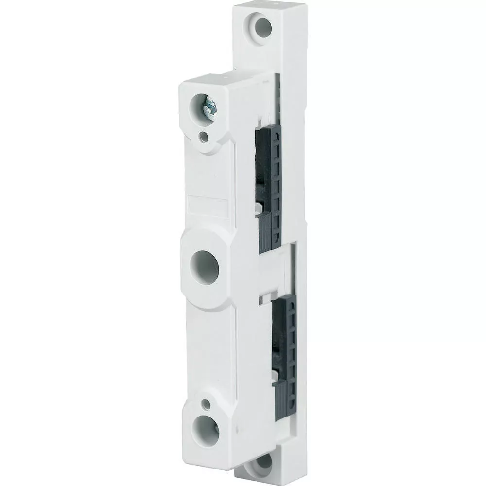 IEC-Sammelschienenträger, 60-mm-System, Bemessungsbetriebsstrom le = 630 A, Pole=2, verwendbar für 12 x 5/10, 15x5/10, 20x5/10, 25 x 5/10 und 30 x 5/10, mit Rastschieber zum Anpassen an jeweilige Schienengröße, mit innen liegenden Anschraublöchern, temperaturbeständig bis 120 °C, Kriechstromfestigkeit CTI 200, selbstauslöschend UL 94, RAL 7035, Thermoplast, silikonfrei, chlorfrei, halogenfrei, Abstand zwischen Sammelschienenträgern entsprechend Kurzschlussfestigkeitsdiagram, Zulassung nach UL