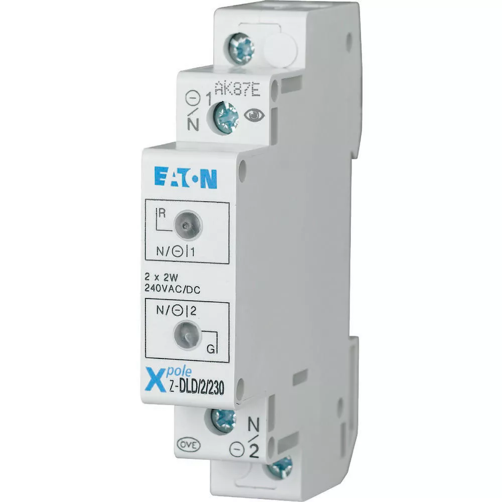 Doppelleuchte, LED-Bemessungsbetriebsspannung 230 V AC/DC, LED-Farbe Weiß und Weiß, Helligkeit 15 mcd, Verlustleistung 2 W/LED, Blinkfrequenz norm. 2 Hz, Kappenmaß 45 mm, Montagebreite 1 SU (17,5 mm), Hutschienenmontage, Klemmenquerschnitt 1 bis 10 mm², Typ gemäß IEC/EN 60669, VDE 0632