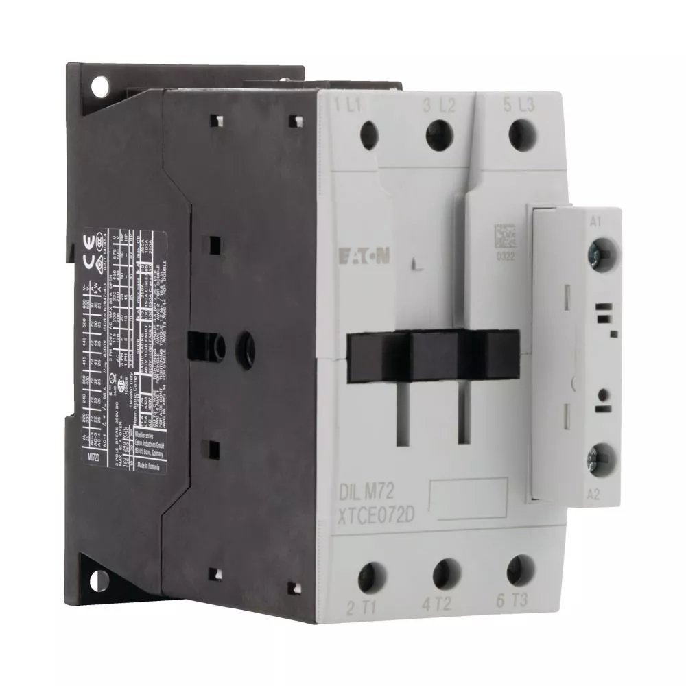 Stycznik, Zastosowanie: Styczniki do silników, Styczniki do 170 A, 3-biegunowy, Kategoria użytkowa: AC-1: Obciążenia nieindukcyjne lub obciążenia o małej indukcyjności, piece oporowe, NAC-3: Standardowe silniki indukcyjne AC: rozruch, wyłączanie w trakcie pracy, AC-4: Stand. silniki indukcyjne AC: rozruch, podłączanie, cofanie, praca spowolnion, Sposób podłączenia: Zaciski śrubowe, Uwagi: Nie nadaje się do silników o klasie sprawności IE3., Liczba biegunów: 3-biegunowy, Znamionowy prąd roboczy AC-3, 380 V 400 V: Ie= 72 A, Znamionowy prąd roboczy AC-1 Prąd cieplny umowny na wolnym powietrzu, 3-biegunowy, 50–60 Hz Otwarcie przy 40°C: Ith =Ie= 98 A, w obudowie: Ith = 72 A