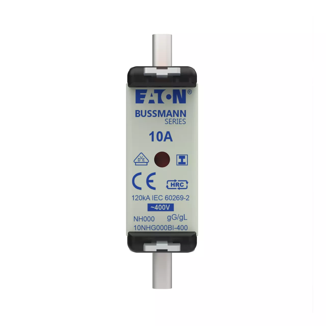 zekering, zekeringelement, Lage spanning, 10 A, AC 400 V, NH000, gL/gG, IEC, dubbel (combinatie-) meldersysteem, vierkant huis met mescontacten, geïsoleerde grepen, IEC 60269-2 zekeringsysteem A, DIN 43620, VDE 0636-2. Uitschakelvermogen 120 kA